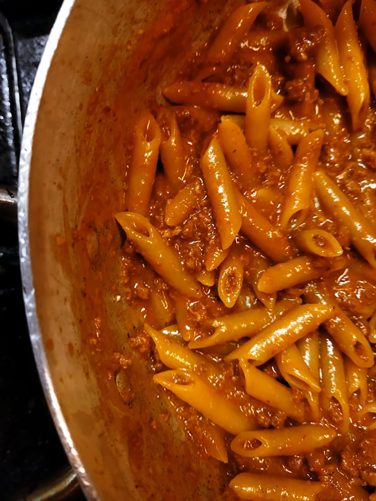 Durante la cottura del sugo, assaggiate sempre per vedere se si è ben insaporito e se occorre un altro po’ di olio e sale. Quando il ragù sarà cotto, e qui viene la particolarità di questo piatto, dovrete buttare le penne direttamente nel sugo allungando se necessario con il brodo che avete messo da parte. fate cuocere le penne fino a cottura ultimata secondo i tempi di cottura riportati in confezione.