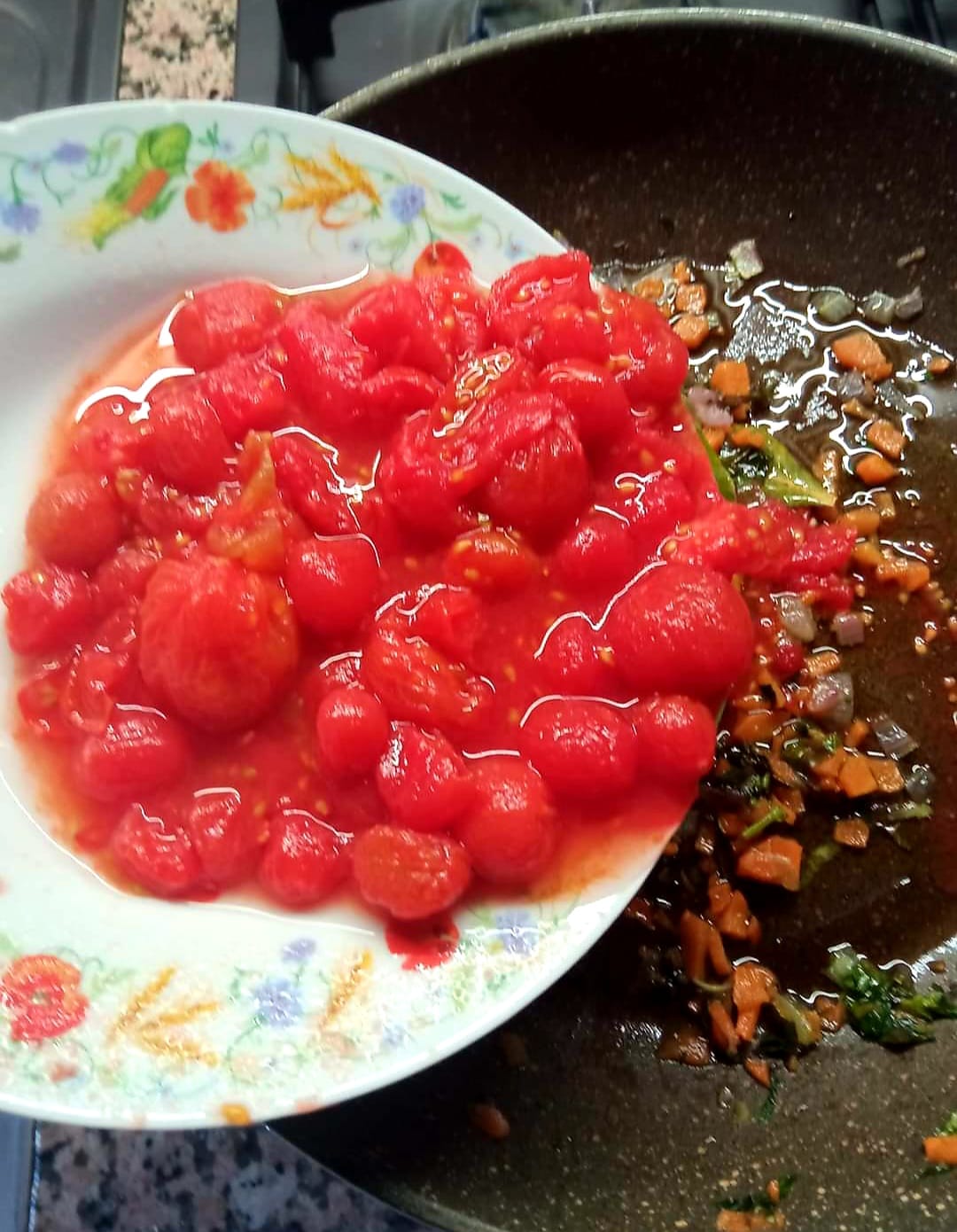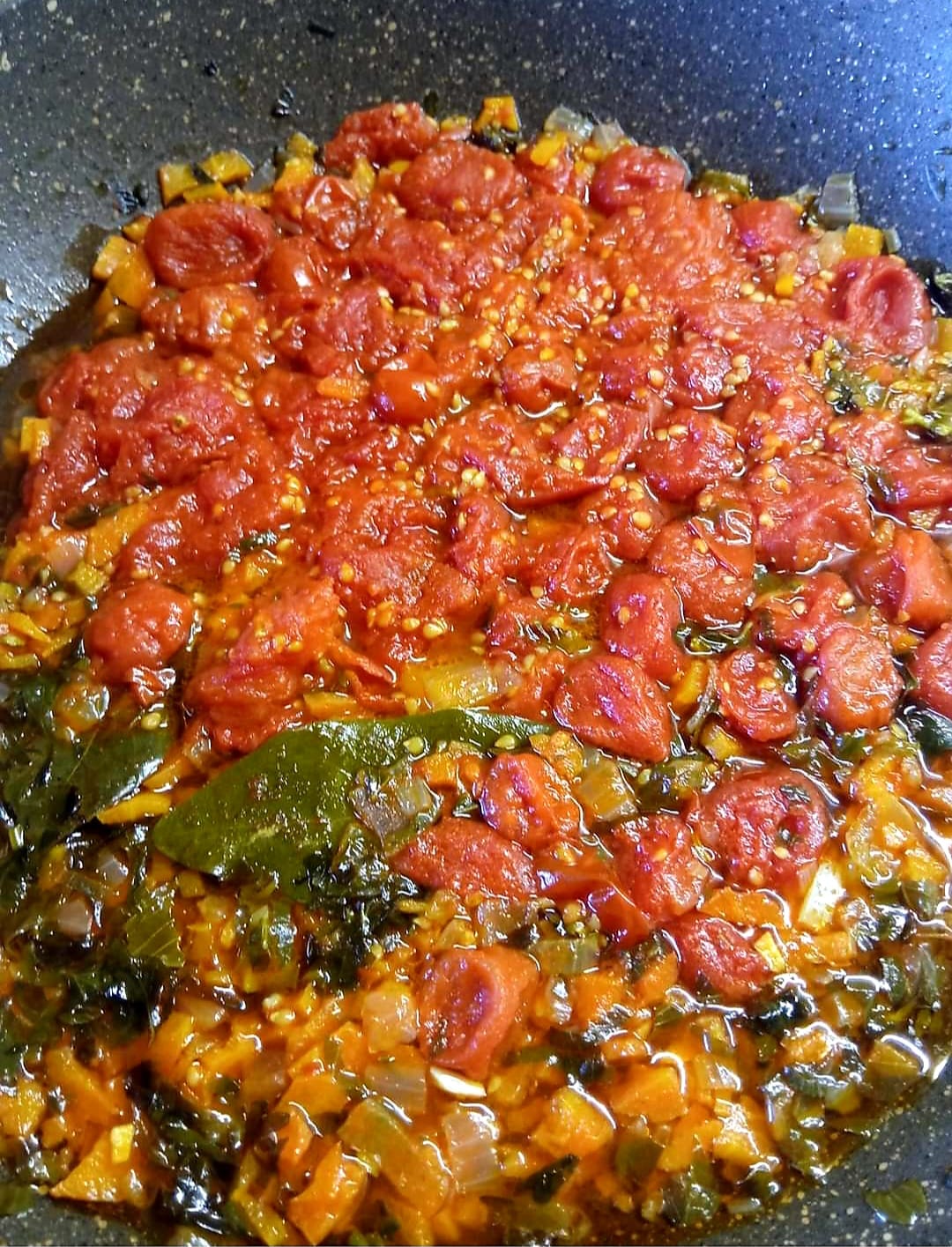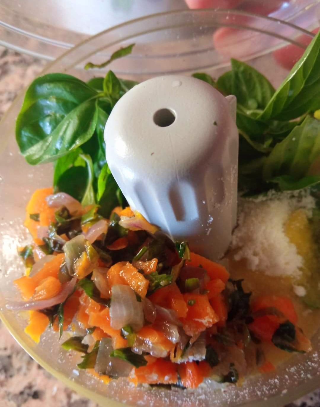 Tritare le carote, la cipolla, l’aglio, prezzemolo e una parte di basilico. Mettere il tutto in una padella con un goccino di olio e lasciarli andare a fuoco lento per 4/5 minuti. Una metà del composto metterlo da parte e nel restante aggiungere i pomodorini ( io ho tolto la buccia ) salare e fare cuocere per 15/20 minuti a fuoco lento. Da parte tritate con il robot da cucina da prima le nocciole per poi aggiungerci l’altra parte di basilico, la grana e il restante del composto che avevamo messo da parte.