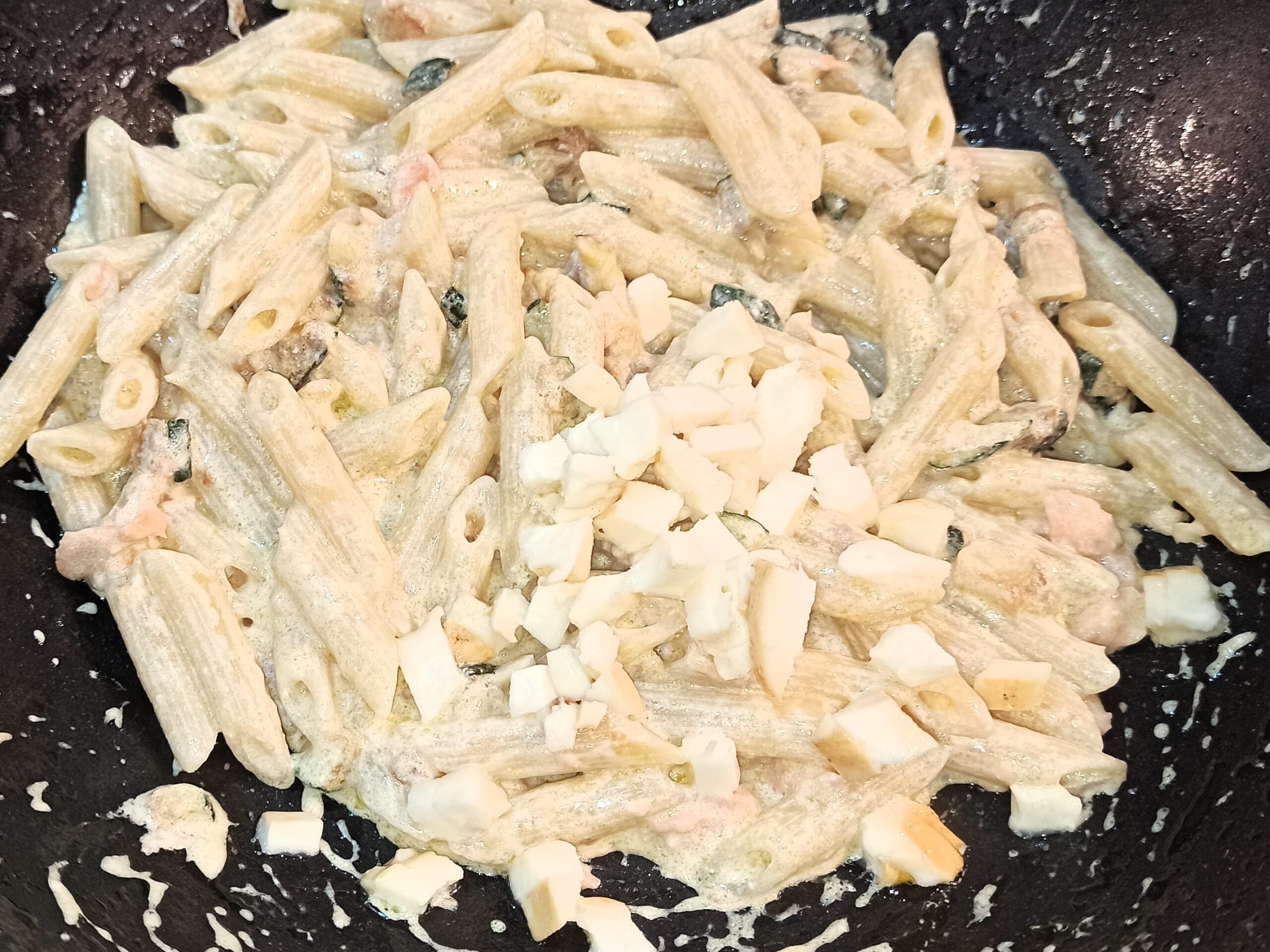 spadellare, appena il condimento si sarà addensato, spegnete la fiamma e aggiungete la provola affumicata tagliata a cubetti.