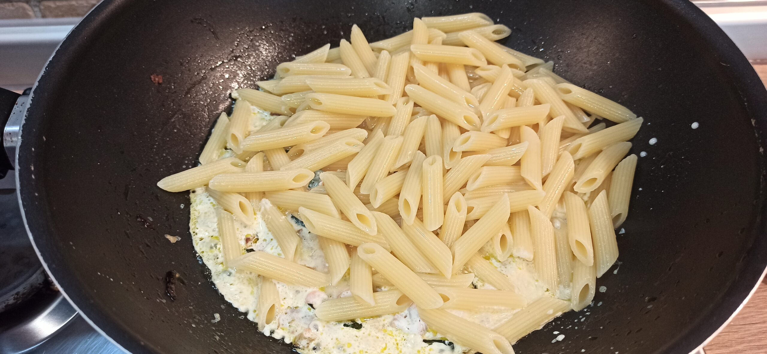 mescolare e fare insaporire per cinque minuti a fiamma bassa. Colare la pasta direttamente nella padella, mescolare,