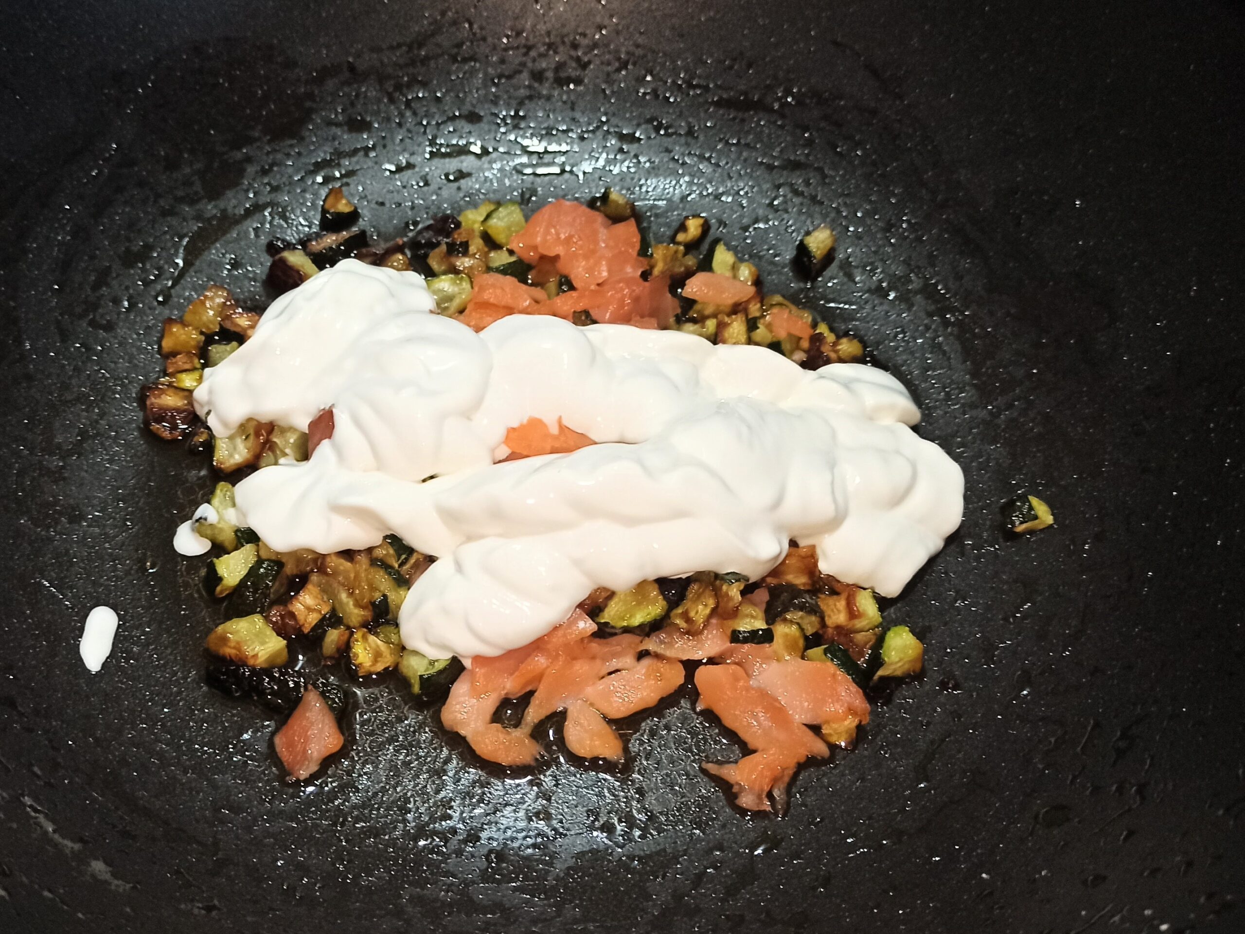 In una capiente padella, mettere un giro d’olio evo, fare soffriggere ed eliminare lo spicchio d’aglio. Aggiungere le zucchine, e farle rosolare a fiamma media. Appena saranno rosolate, aggiungere il salmone affumicato, tagliato a pezzetti, aumentare la fiamma, sfumare con il vino bianco. Appena l’alcol sarà evaporato, aggiungere la panna,