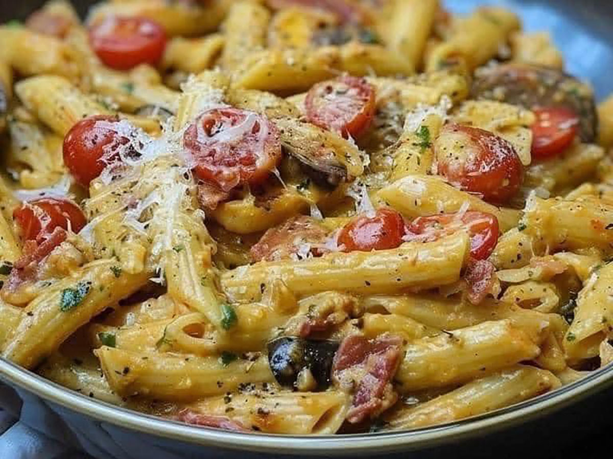 Penne Cremose con Pomodorini, Pancetta e Funghi