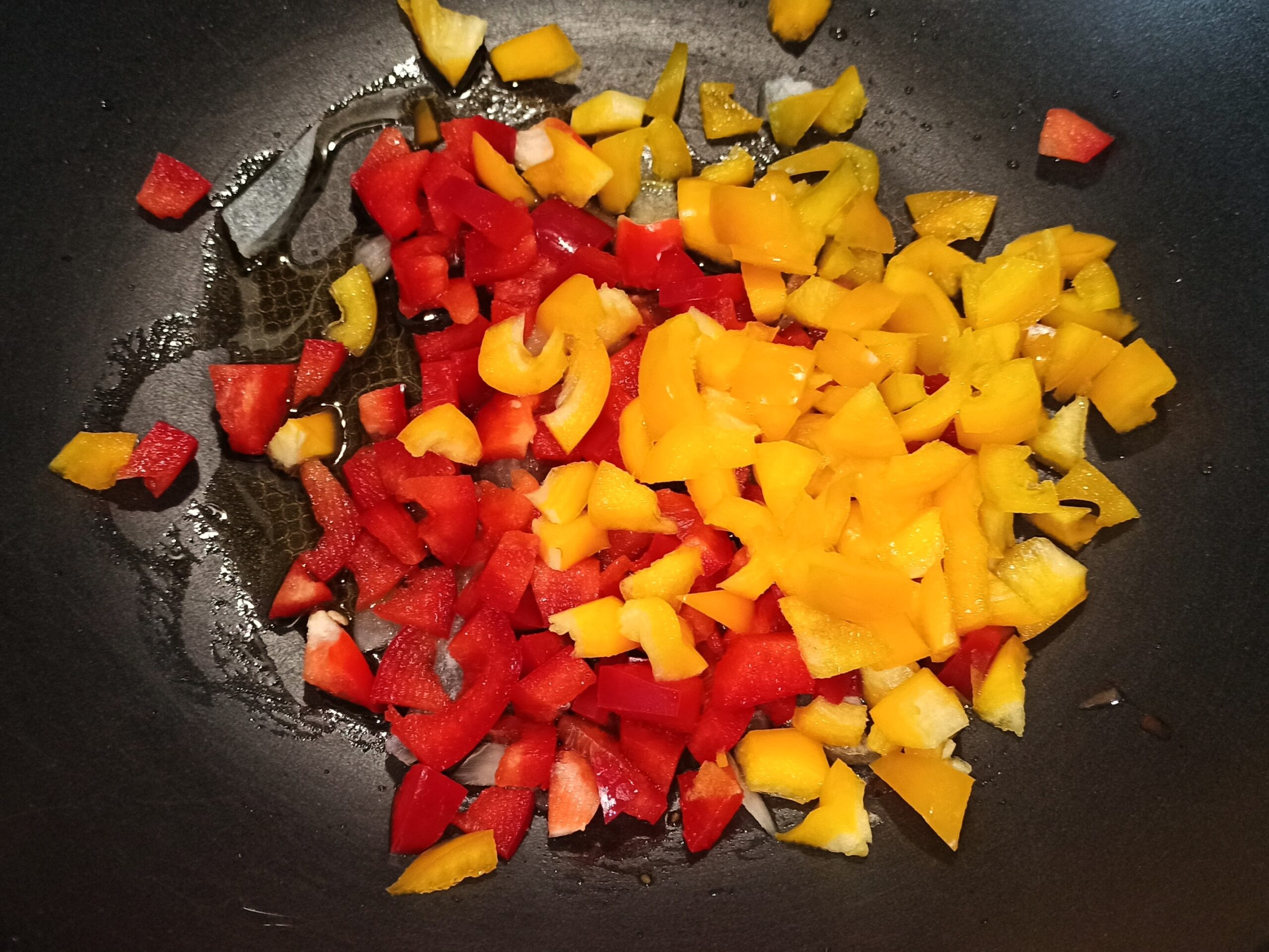Fateli rosolare, poi aggiungete i peperoni, e fateli cuocere per un paio di minuti a fiamma alta.
