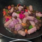 Aumentate la fiamma, fate rosolare in maniera uniforme, sfumate con il vino bianco. Aggiungete i peperoni, le olive, mescolate, e fate cuocere per dieci minuti, regolate di sale. Impiattate, servite e gustate.