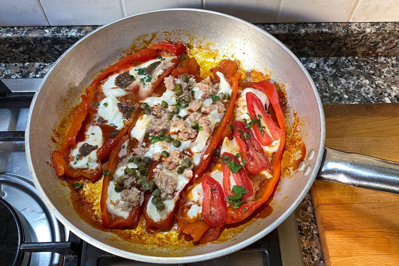 Lavate i peperoni e rimuovete gambo e torsolo interno, quindi tagliateli in 3 o 4 falde ciascuno, a seconda della forma, ed eliminate semi e nervature. Precuoceteli in microonde per 6 minuti alla massima potenza o in forno a 180 °C per 15-20 minuti, finché non diventano teneri. In una padella, versate 4 cucchiai d’olio di oliva e adagiatevi i peperoni spianandoli bene.