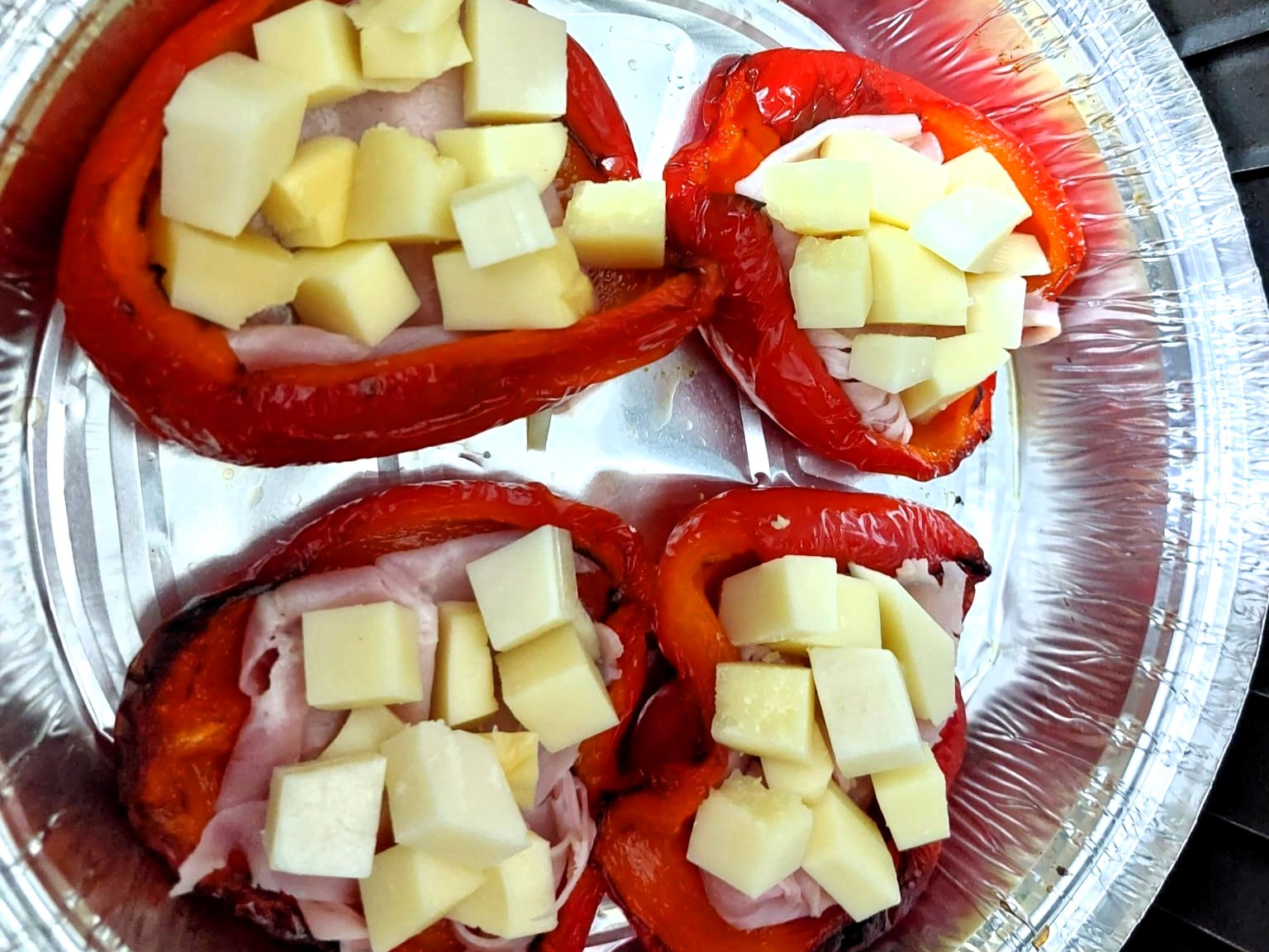 Nel frattempo tagliate a cubetti la scamorza, il formaggio dolce ed il pecorino, che donerà al ripieno un tocco di sapidità. Posizionate sul fondo di ogni peperone, un paio di fette di prosciutto cotto, poi aggiungete il mix di formaggi, un pizzico di pepe e di nuovo in friggitrice ad aria a 200° per dieci minuti.