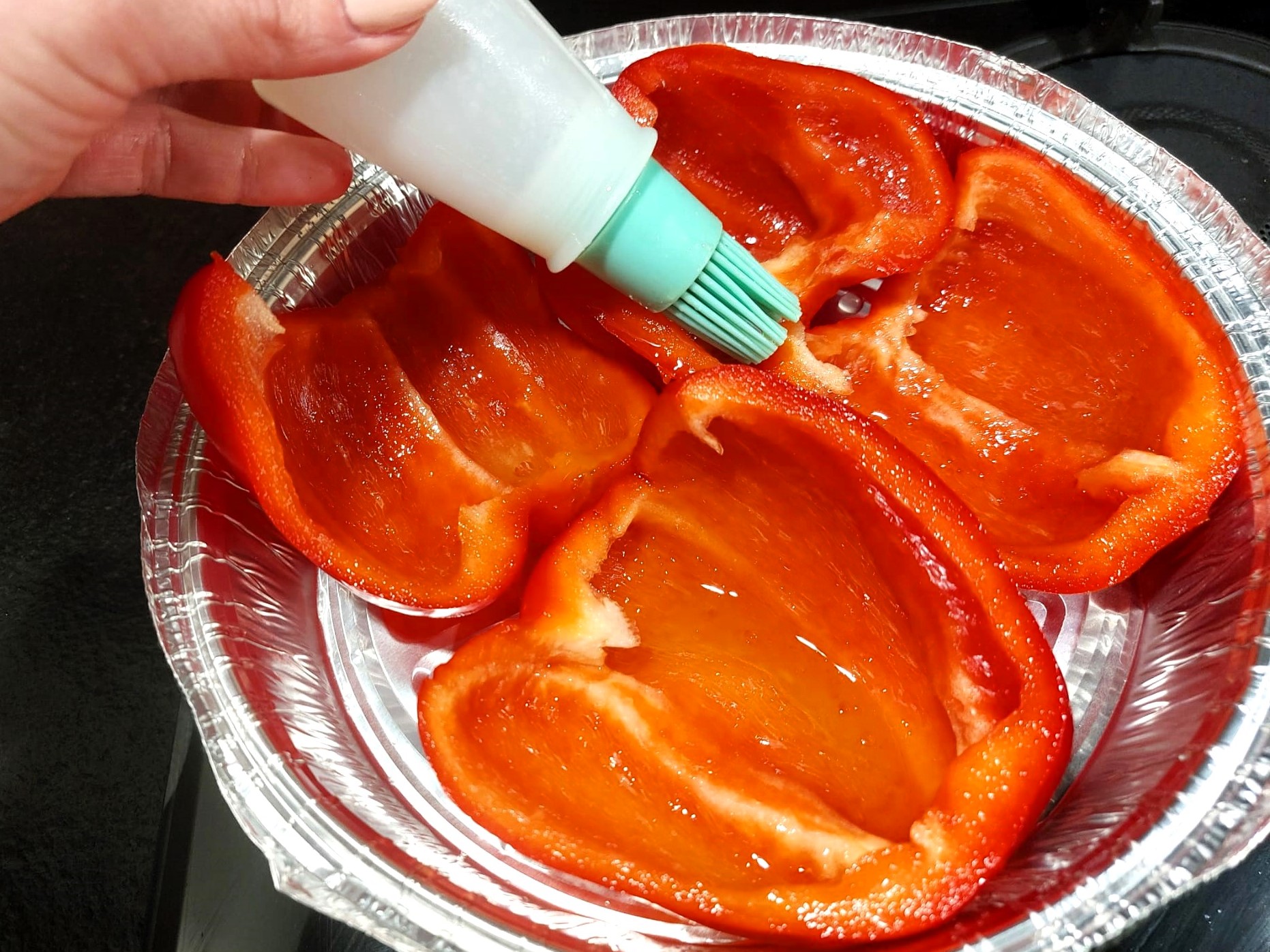 Con l’aiuto di un pennellino cospargete d’olio la superfice interna ed esterna dei peperoni, poi regalate di sale. Mettete i peperoni in una teglia, e iniziate a cuocere in friggitrice ad aria per cinque minuti a 200°.