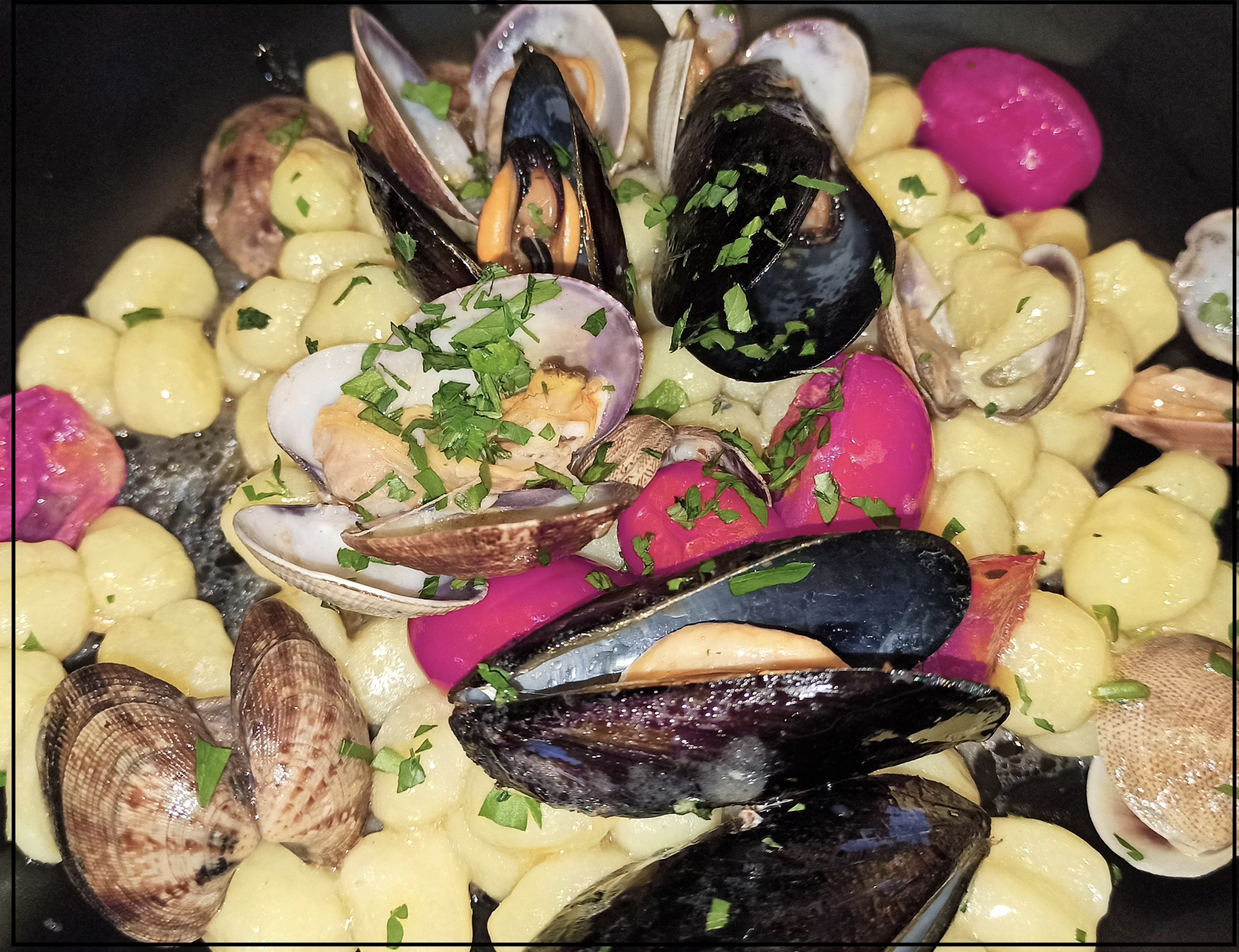 Tagliate a tocchetti i singoli salsicciotti, dategli una forma sferica, senza lavorarli troppo, e sistemate le pepite su un canovaccio infarinato. Copritele con altro canovaccio e dedicatevi al condimento. Lavate i frutti di mare sotto abbondante acqua corrente, fateli aprire a fiamma vivace, avendo cura di prelevarli appena si aprono e metterli in una ciotolina, infine filtrate il liquido rilasciato.