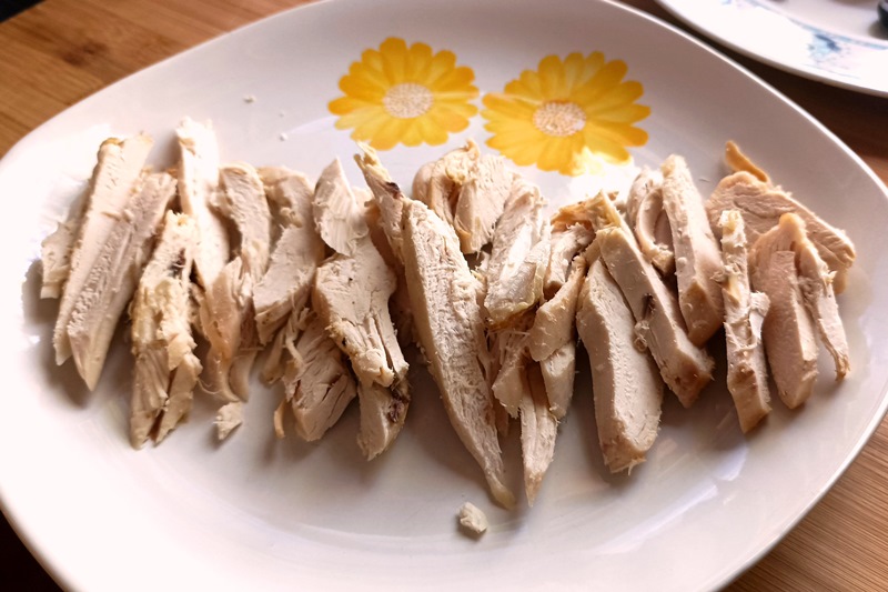 in alternativa lessate il petto di pollo in acqua salata con carota, sedano e cipolla, scolate e lasciate raffreddare: con questo tipo di cottura potete ottenere in delicato brodino che potrete utilizzare con la pastina, per fare un risotto o allungare un sugo.