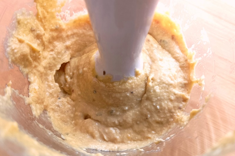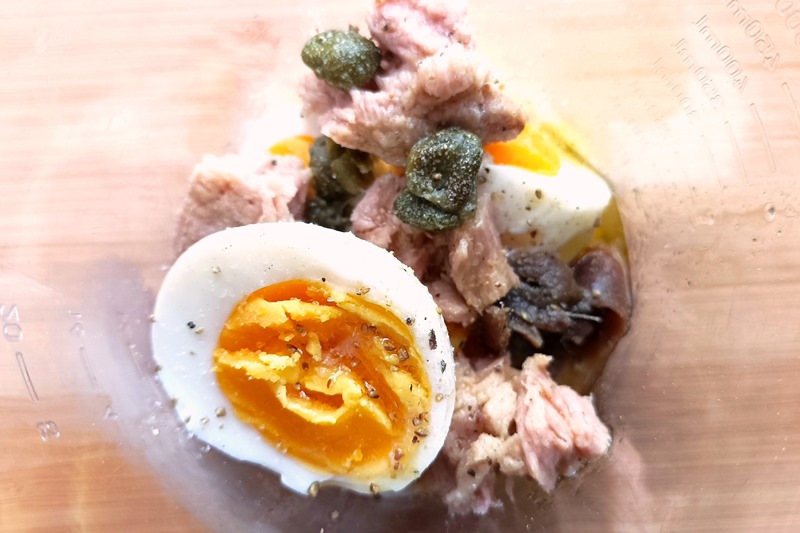 Nel bicchiere del frullatore ad immersione inserite le uova sode spezzettate, capperi, tonno non sgocciolato, acciughe, sale e pepe, e frullate per ottenere un composto cremoso e saporito.