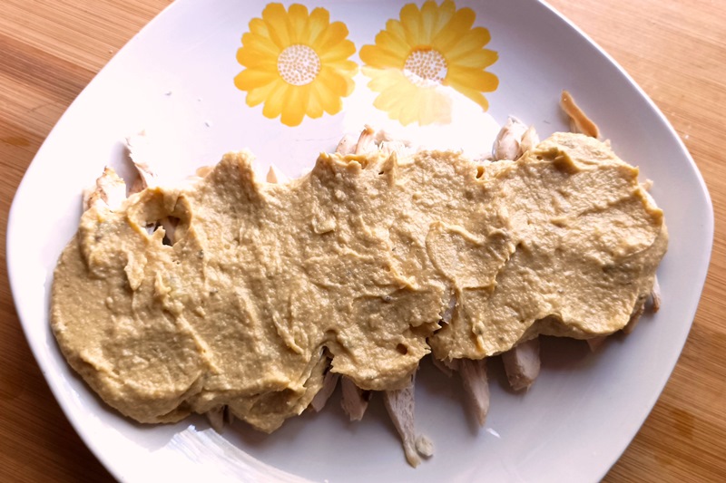 Disponete il petto di pollo tagliato a listarelle su un piatto da portata, e cospargetelo con la salsa;