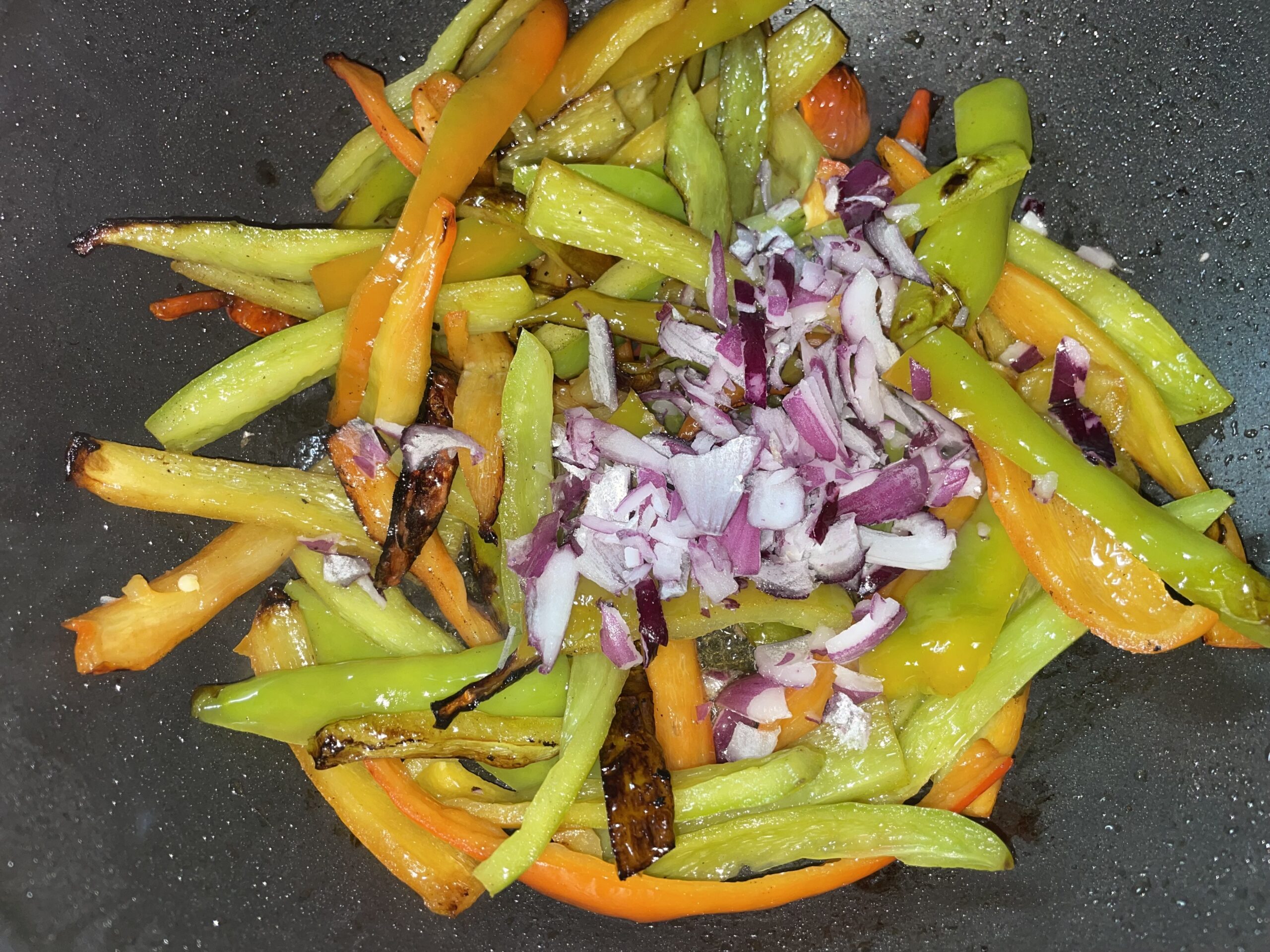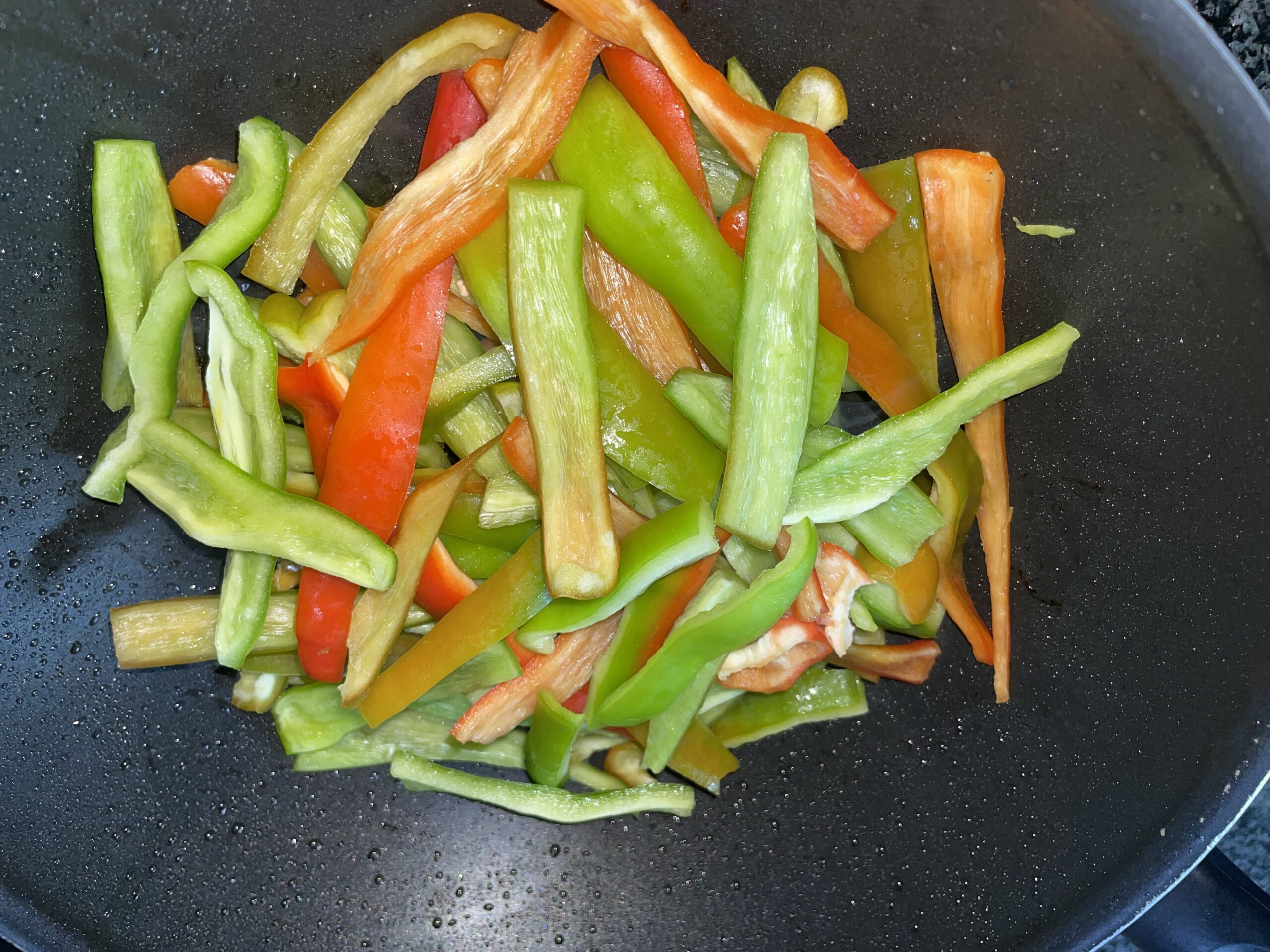 Nel frattempo lavate i peperoni, asciugateli, eliminate il picciolo, divideteli a metà nel senso della lunghezza, eliminate anche i semi e i filamenti interni. Tagliateli a striscioline, che dividerete a metà. Appena le patate saranno pronte, mettetele su un foglio di carta assorbente. Nella stessa padella, iniziate a cuocere i peperoni.