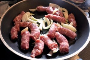Nel frattempo preparate il sugo di luganega con pomodoro e cipolle; in una padella fate appassire le cipolle tagliate a fettine sottili in pochissimo olio, unite la luganega tagliata a pezzetti, lasciando il budello. Quando sarà ben rosolata sfumate con il vino e lasciate evaporare; aggiungete la passata di pomodoro, il rosmarino, sale e pepe, e cuocete per 15 minuti con il coperchio facendo restringere il sugo, spegnete e lasciate intiepidire.