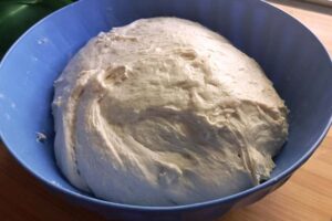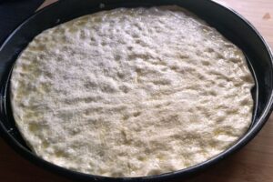 Mettete la farina all’interno di una ciotola capiente, ed al centro praticate una fontana, dove mettere il lievito di birra fresco sciolto in poca acqua tiepida; aggiungete lo zucchero, l’olio extravergine d’oliva ed infine il sale. Amalgamate tutti gli ingredienti con una forchetta, aggiungendo poco alla volta tutta l’acqua tiepida; continuate ad impastare a mano, per circa 10 minuti, fino a quando otterrete un impasto soffice ed elastico, non più appiccicoso; copritelo la ciotola con della pellicola per alimenti, e mettete a lievitare in un luogo caldo per almeno due ore, fino a quando raddoppierà di volume.