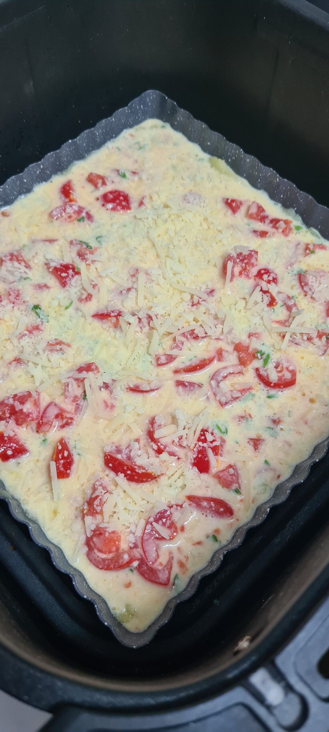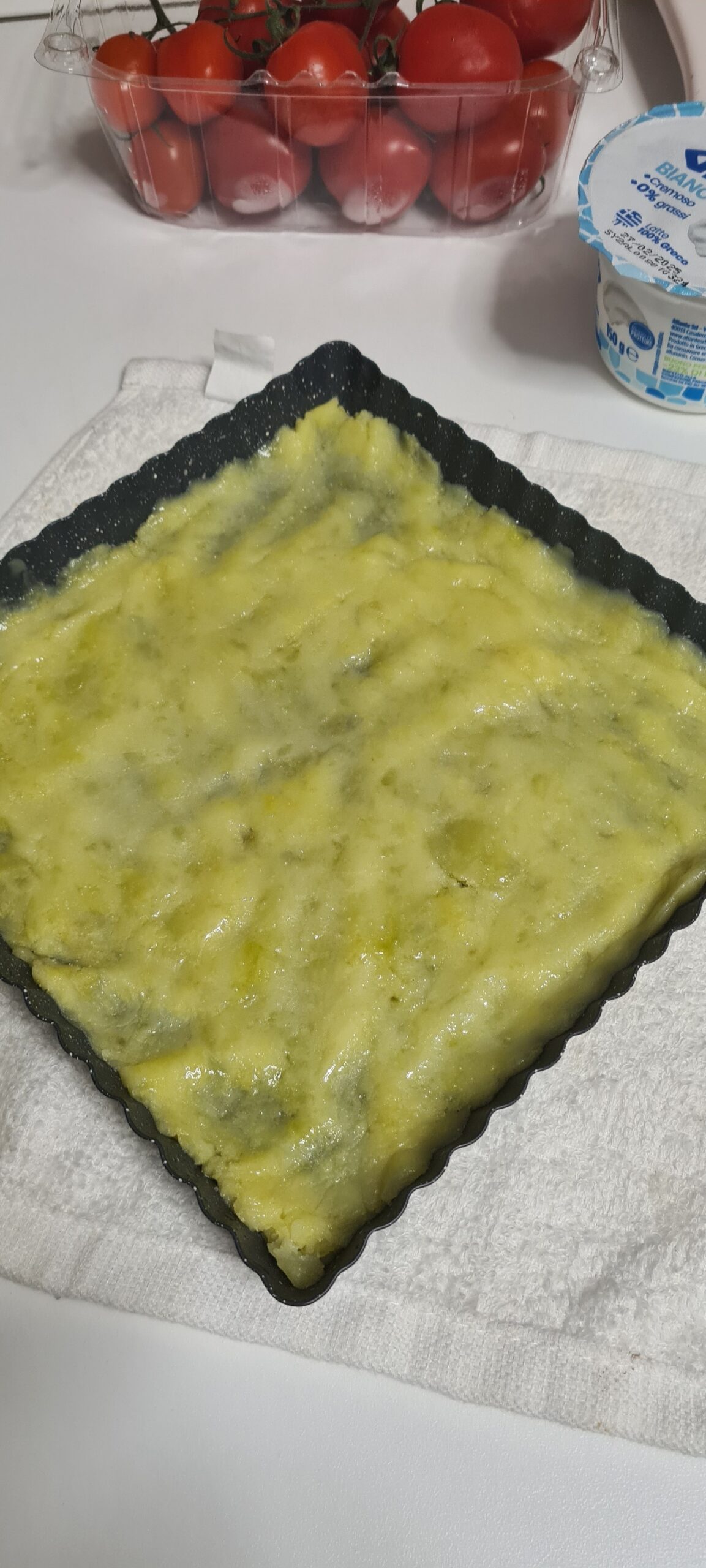 Iniziate lessando le patate e, una volta tiepide, schiacciatele con uno schiacciapatate. Mettetele in una ciotola e aggiungete lo yogurt greco, l’uovo, il parmigiano, il prezzemolo, un pizzico di sale e una spolverata di pepe. Mescolate il tutto fino a ottenere un composto morbido e uniforme. Foderate con carta forno una teglia adatta alla friggitrice ad aria (o al forno tradizionale) e versate l’impasto. Schiacciatelo bene con un cucchiaio per ottenere una base compatta e regolare. Distribuite sopra i formaggi a julienne e adagiate i pomodorini datterini tagliati a metà, con la parte del taglio rivolta verso l’alto. Aggiungete un filo d’olio se lo desiderate. Cuocete in friggitrice ad aria a 180°C per 15 minuti, fino a doratura. In forno tradizionale: 190°C statico per circa 20-25 minuti.