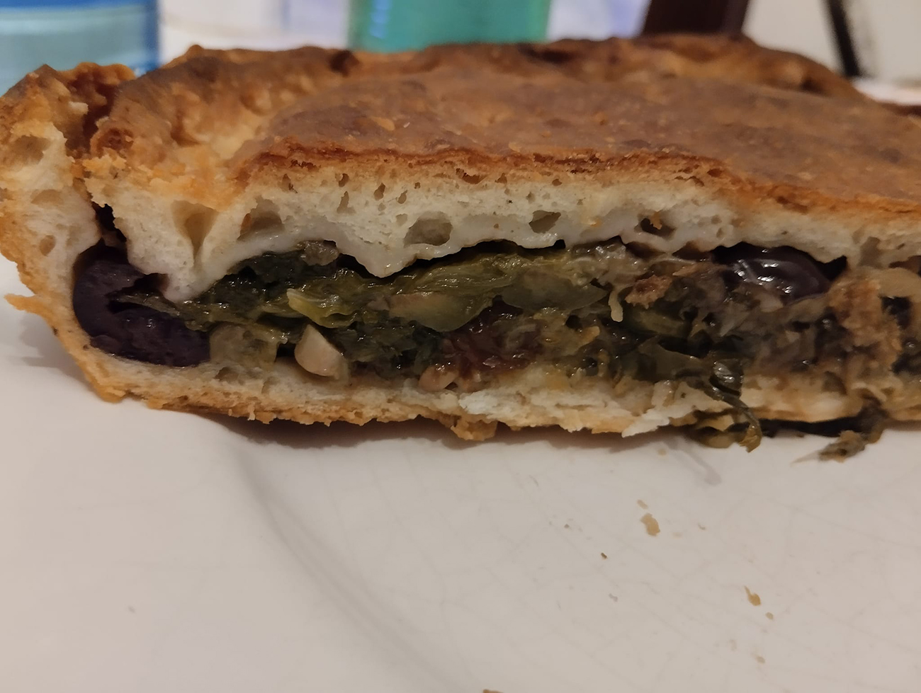 Adesso la Preparazione del ripieno: Lavare accuratamente le foglie esterne della scarola e lessatele in acqua bollente salata per pochi minuti. Scolatele, strizzatele bene e tagliatele a pezzi. In una padella, scaldare un filo d’olio con l’aglio ei filetti di acciuga, facendoli sciogliere a fuoco dolce. Aggiungete le olive, i capperi ei pinoli, lasciando insaporire per qualche minuto. Unire la scarola e, se gradito, un po’ di peperoncino. Saltate il tutto per amalgamare i sapori e aggiustate di sale se necessario.