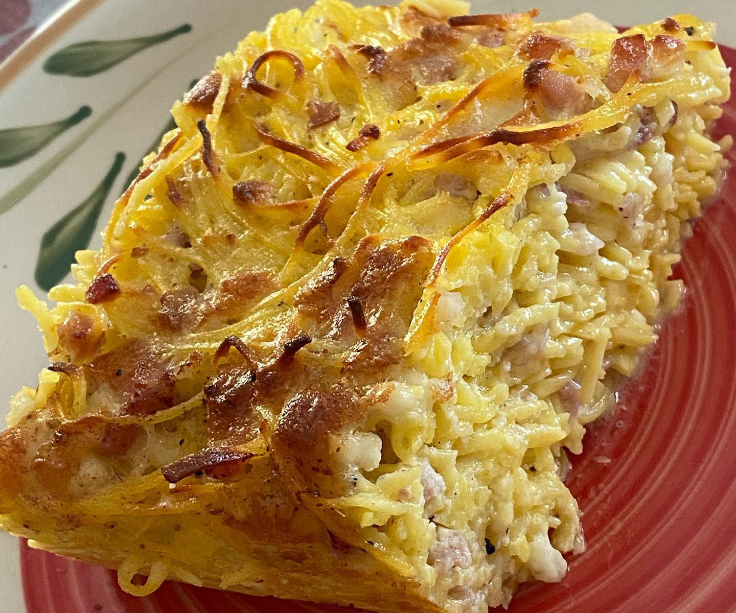 Se avete usato la pasta secca, verste anche un po’ di acqua di cottura, se avete usato quella fresca non c’è bisogno. Amalgamate bene tutti gli ingredienti e passate in teglia. Imburratela oppure date una passata di strutto e versate i tagliolini al suo interno. Fate cuocere in forno a 180 gradi per 40 minuti. Dovete ottenere una bella crosta dorata. La vostra pizza di tagliolini è pronta. Da Giugliano è tutto, buon appetito.