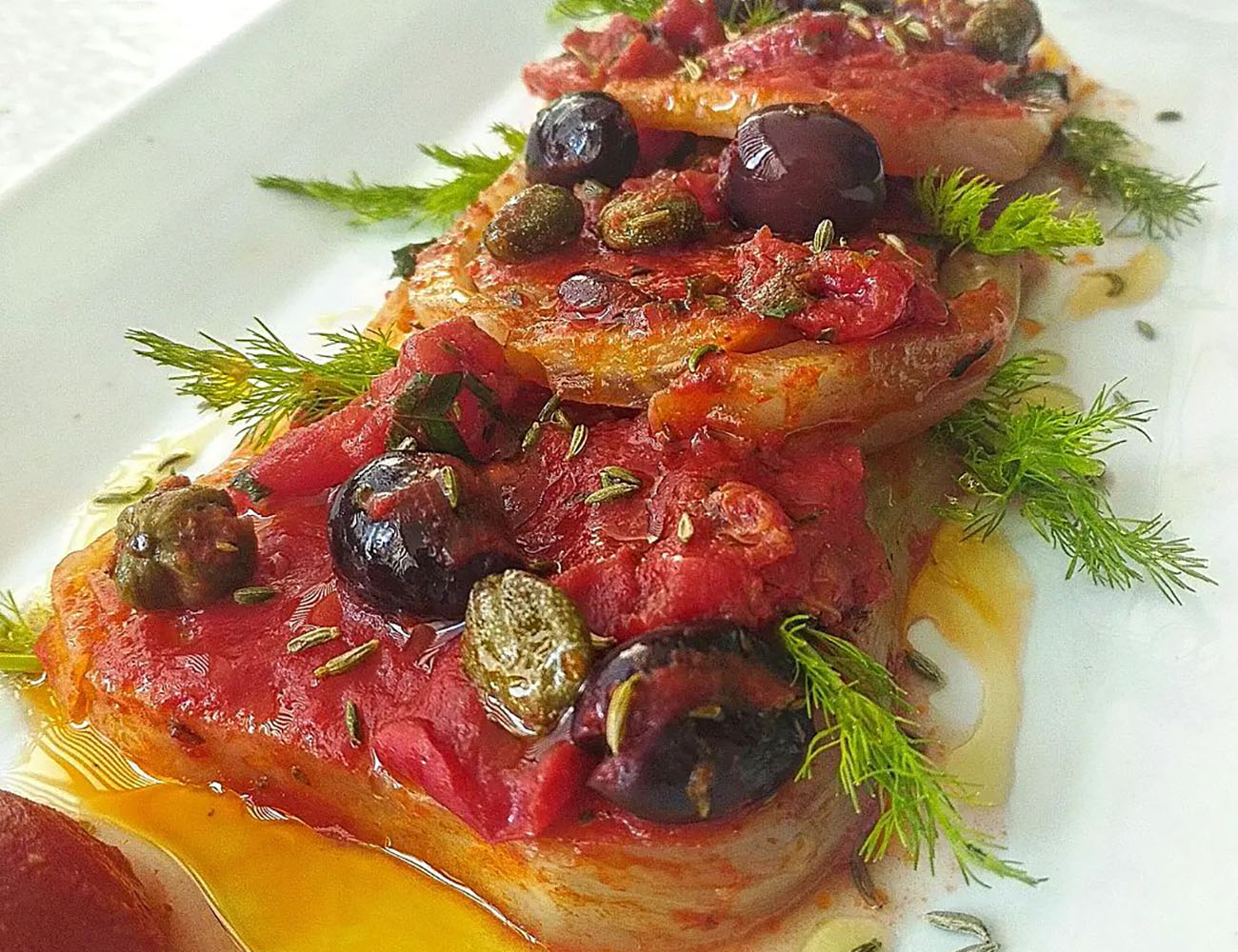 Tagliate a fette di spessore non troppo grandi. Trasferite in una padella con acqua fredda e sale, facendo attenzione che l’acqua non superi il livello dei finocchi. Portate a bollore l’acqua e fate stufare con coperchio chiuso i finocchi. Devono cuocere per un tempo di circa 15 minuti, ma controllate sempre con una forchetta la cottura. Schiacciate i pomodori con una forchetta in maniera grossolana , unite le olive, capperi, origano, aglio e in fine olio extravergine di oliva.