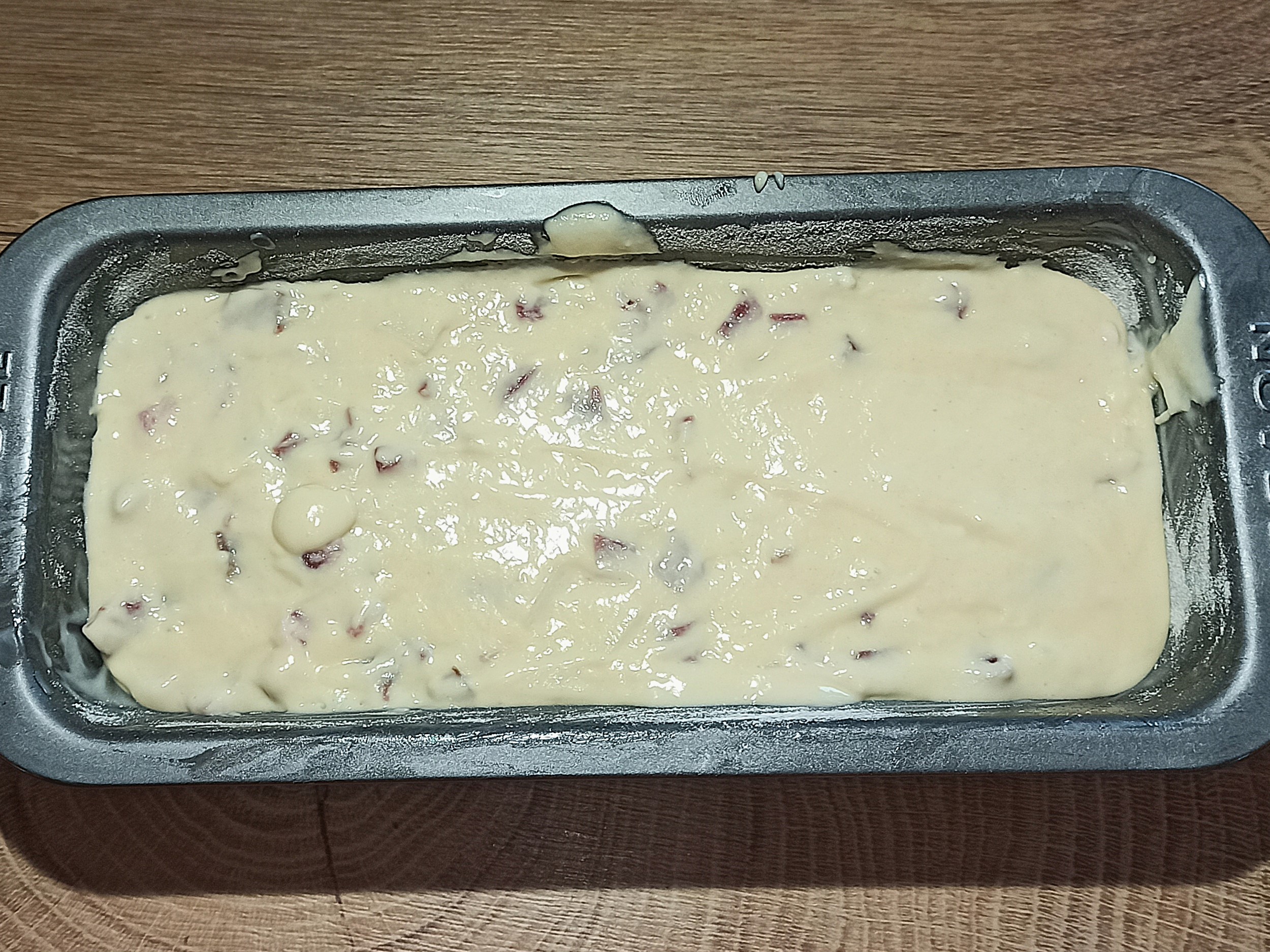 Imburrate ed infarinate uno stampo da plumcake, versate dentro l’impasto, e livellatelo con l’aiuto di una spatola.