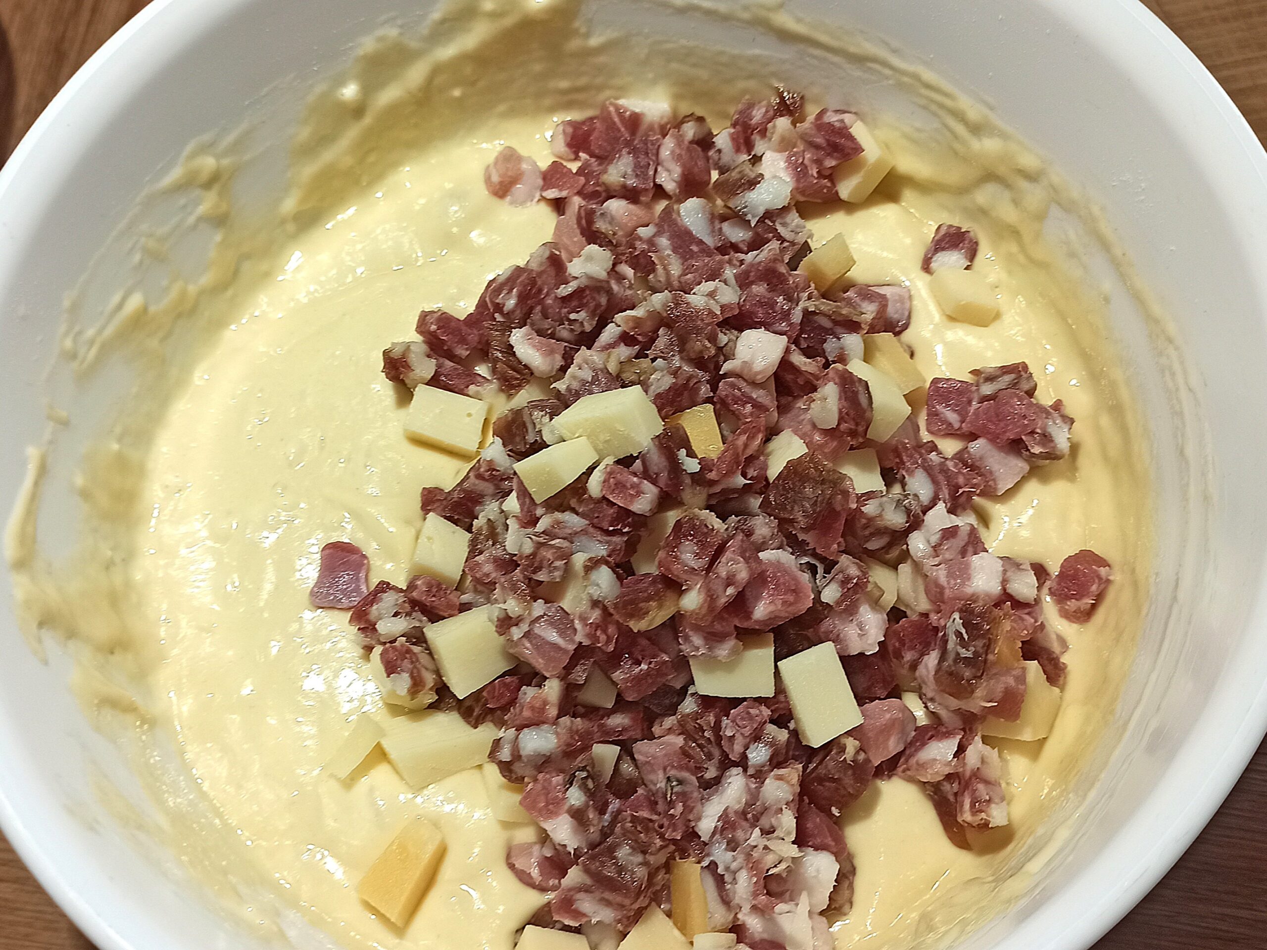 Per preparare il plumcake rustico, iniziate a tagliare a pezzetti i salumi ed i formaggi.
