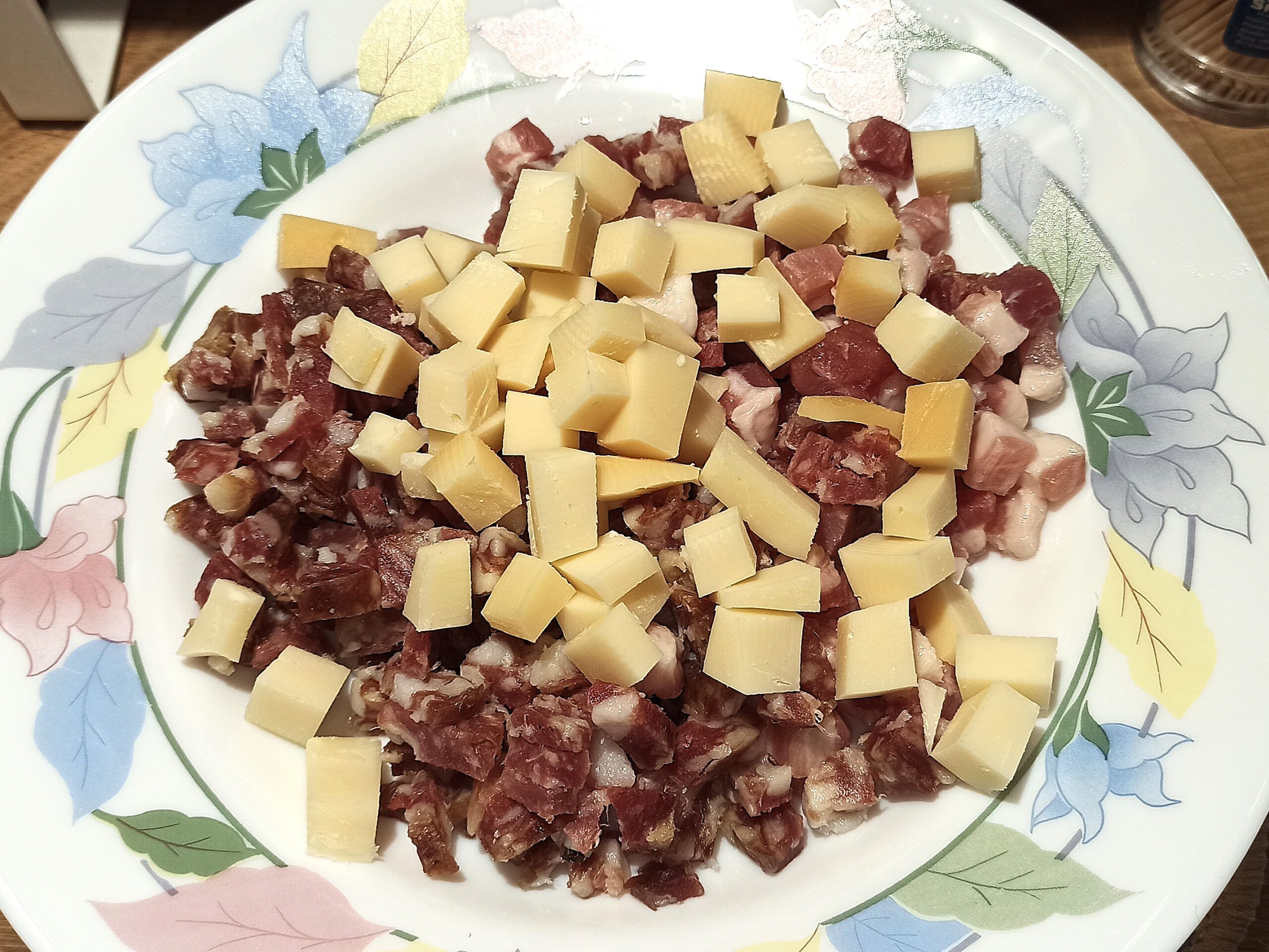 Aggiungete il mix di salumi e formaggi, se gradito potete aggiungere anche un poco di pepe.