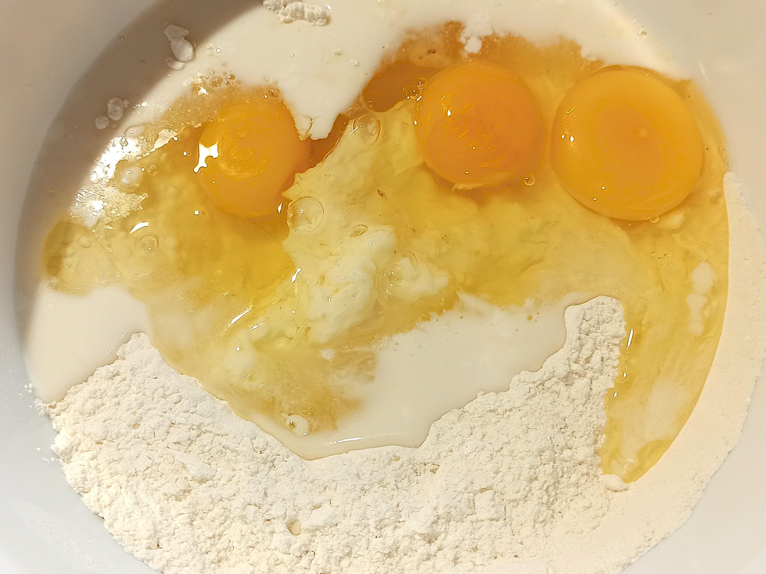 Mescolate, poi aggiungete le uova, il latte l’olio, lo zucchero ed il sale.
