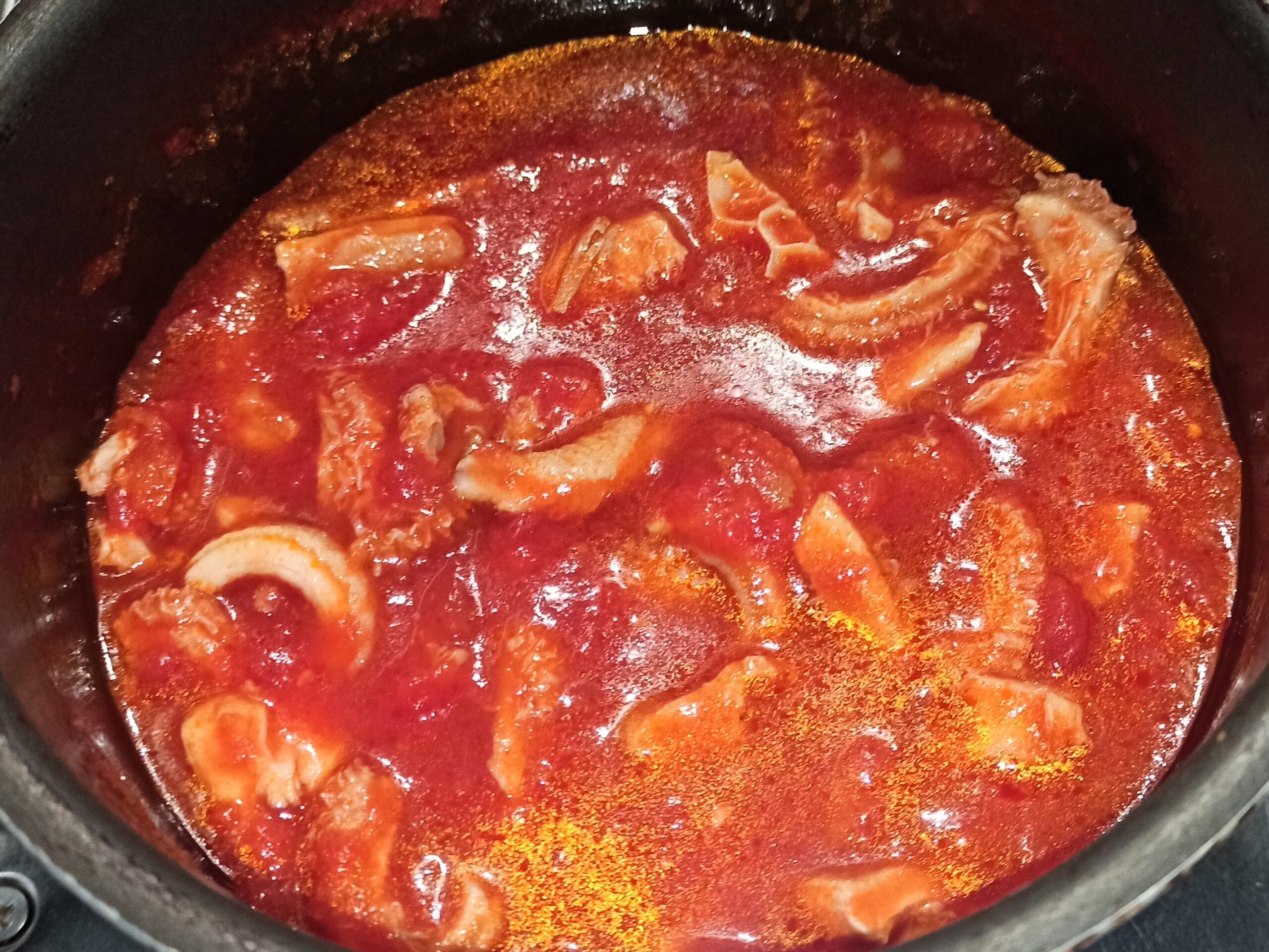 Per preparare la polenta con la trippa, iniziate a lavare la trippa, tagliatela a pezzetti. In una capiente pentola, mettete un giro d’olio evo, aggiungete lo spicchi d’aglio ed il peperoncino. Fate imbiondire l’aglio a fiamma media, poi eliminatelo insieme al peperoncino. Aggiungete i pelati, e fate cuocere per circa dieci minuti. Trascorso questo tempo, aggiungete la trippa, regolate di sale, e continuate la cottura per altri dieci minuti, a fiamma media.