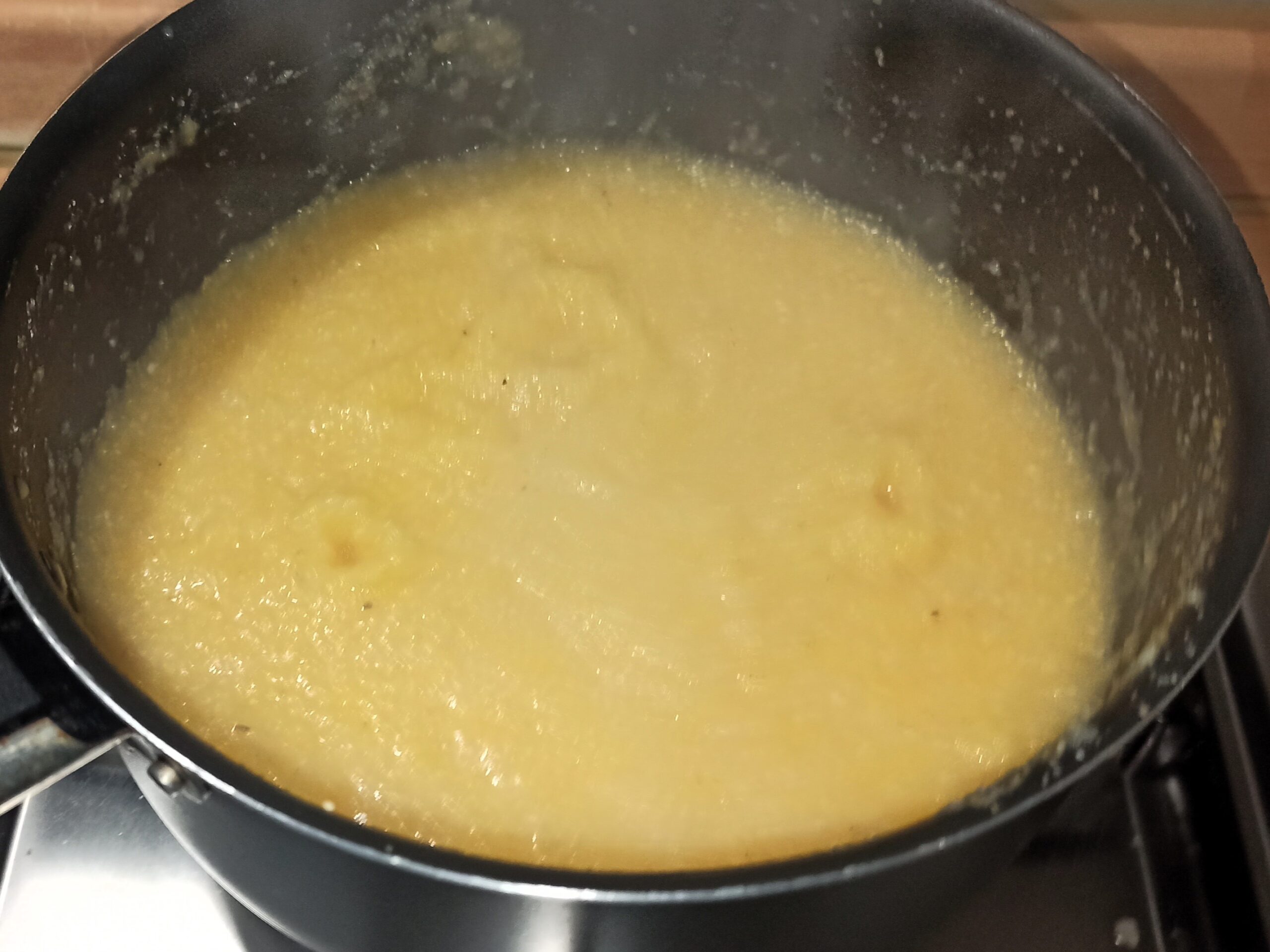 Nel frattempo in un’altra pentola, portate ad ebollizione il brodo vegetale, aggiungete la polenta a pioggia, sempre mescolando, fino a raggiungere la consistenza desiderata.