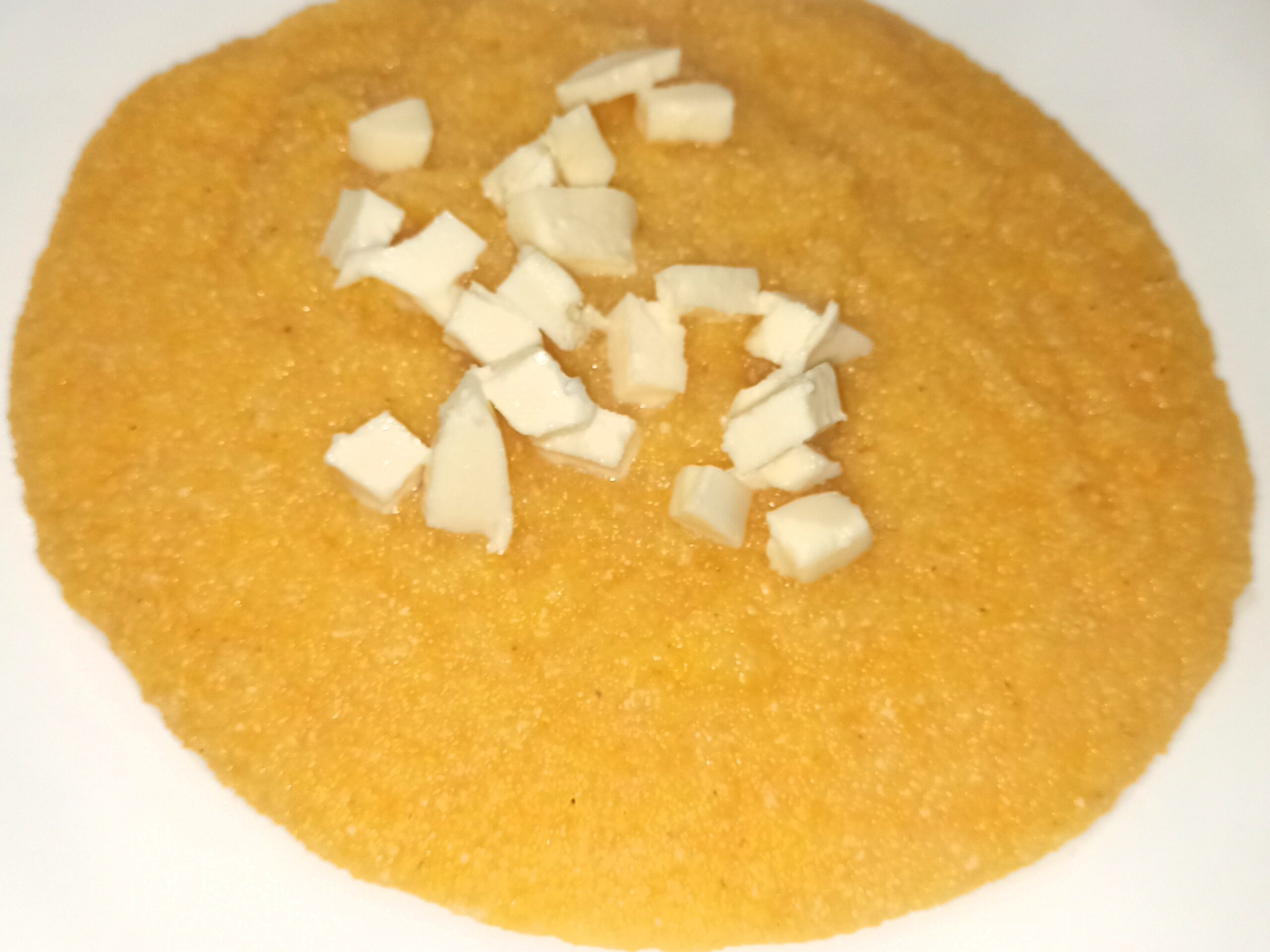 Mettete la polenta sul fondo del piatto, poi in superficie mettete la scamorza tagliata a dadini,