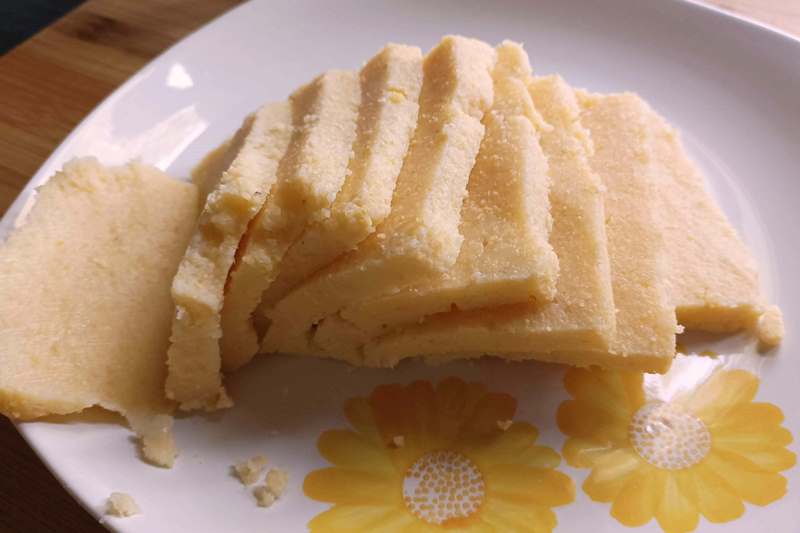 Proseguite con la cottura per 50 minuti a fuoco dolce senza smettere di mescolare, avendo cura di non far attaccare al fondo la polenta; una volta giunta a cottura, versate la polenta in un contenitore e lasciatela raffreddare. Tagliatela a fette o a pezzettoni la polenta ormai fredda, e procedete con la ricetta.