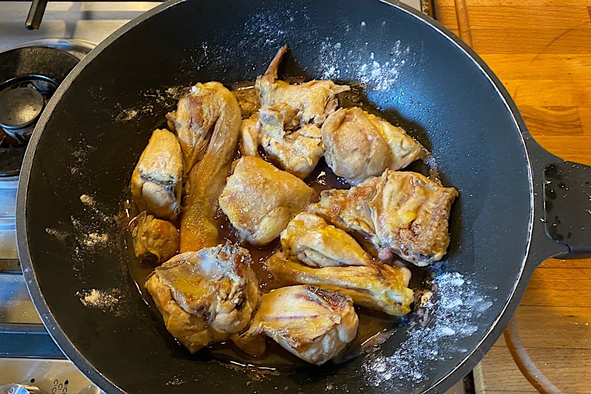 Lavate, asciugate e tagliate il pollo a pezzi abbastanza piccoli. Eliminate tutti gli accumuli di grasso visibili. Io tolgo anche tutta la pelle perché contiene la maggior parte dei trigliceridi: questo è a vostra scelta e non obbligatorio, ma assicura un piatto molto più leggero. Mettete il pollo in padella con 2 cucchiai di olio di oliva e fatelo rosolare bene da tutte le parti, a fiamma allegra, fino a che non sarà tutto sigillato e con macchie marroni qua e là. Buttate tutto in un colapasta e fate scolare il grasso presente. Asciugate la padella con carta da cucina e rimetteteci il pollo con 1 cucchiaio di olio di oliva. Infarinatelo, salatelo poco e pepatelo. Fatelo scaldare bene poi bagnate con un bicchiere di vino bianco secco. Coprite quasi del tutto e cominciate la cottura a fiamma dolce, col liquido di cottura che sobbolle pacatamente. Ogni tanto girate i pezzi. Dopo 15 minuti aggiungete la salsa di pomodoro. Per tutta la cottura, se il fondo si asciugasse troppo, bagnate con acqua calda.