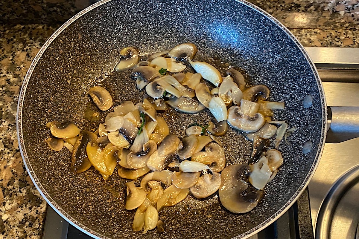 Mentre il pollo cuoce preparate e trifolate i funghi. Lavateli e tagliateli a fettine se necessario. Mettete in un padellino un cucchiaio di olio di oliva e uno spicchio d’aglio senza camicia. Fatelo rosolare per un paio di minuti e aggiungete i funghi con un pizzico di prezzemolo tritato. Bagnate con 2 cucchiai di acqua, salate poco, rimestate e aspettate che i funghi facciano la loro acqua. Appena diventano beige sono pronti, non cuoceteli di più. Mettete da parte lasciando l’acqua di vegetazione se presente.