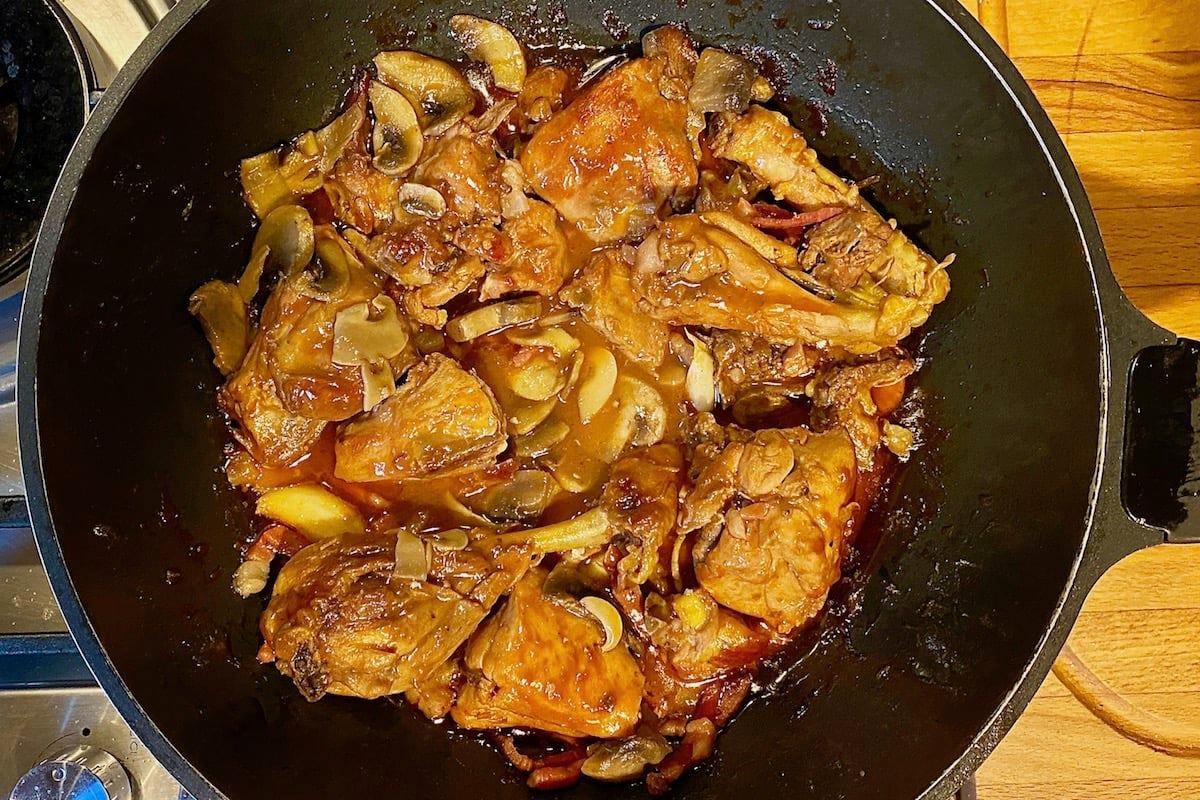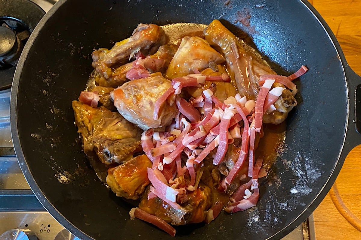 Dopo mezz’ora che il pollo cuoce aggiungete lo speck o la pancetta affumicata tagliati a cubetti o striscioline. Mischiate bene, bagnate con poca acqua se necessario e continuate la cottura, che dovrebbe durare in tutto circa un’ora.