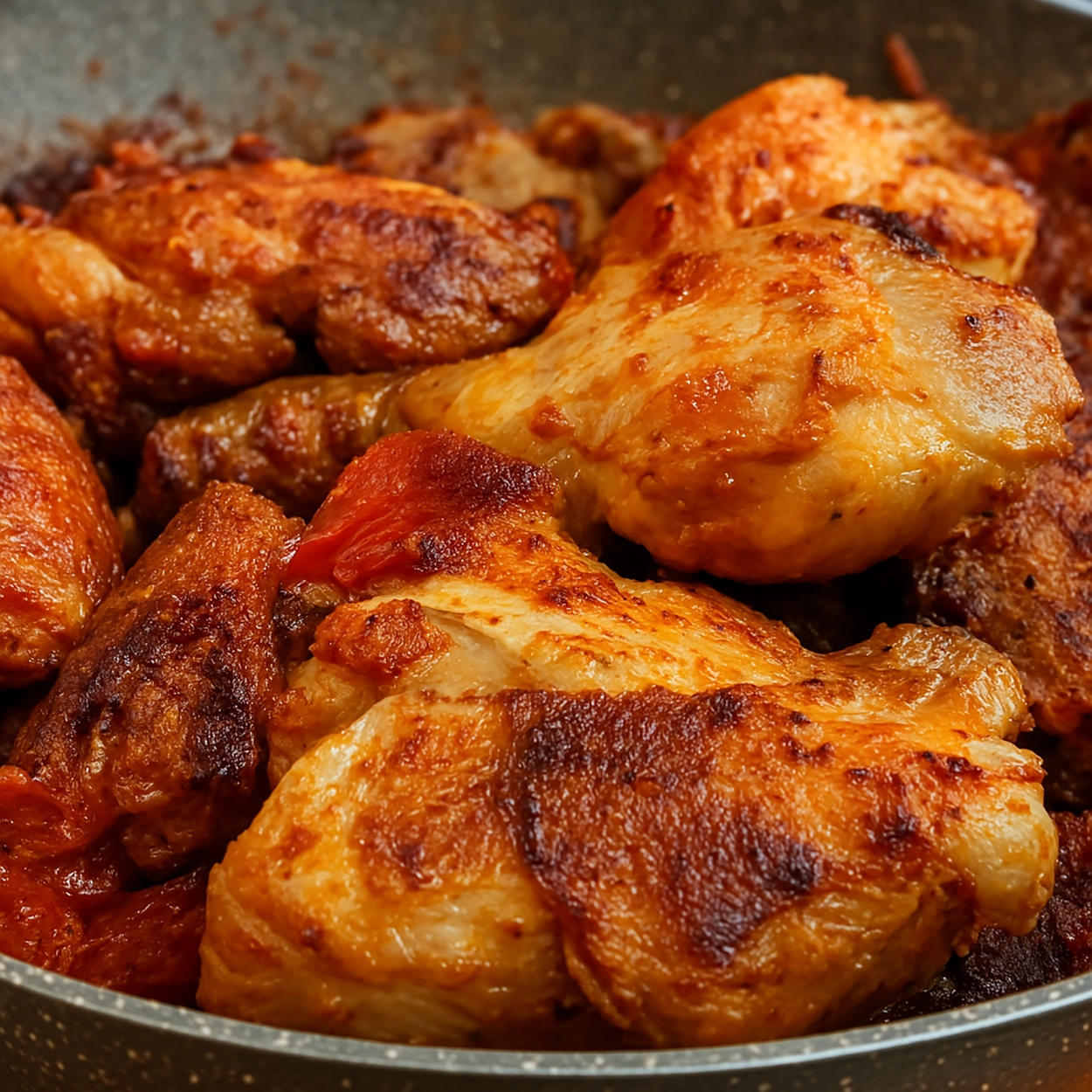 In una padella capiente scalda l’olio e fai rosolare i pezzi di pollo da entrambi i lati finché diventano ben dorati. Togli il pollo e mettilo da parte. Nella stessa padella, aggiungi la cipolla tritata finemente, gli spicchi d’aglio schiacciati (che puoi togliere dopo), e fai soffriggere a fuoco basso finché diventa dorata.