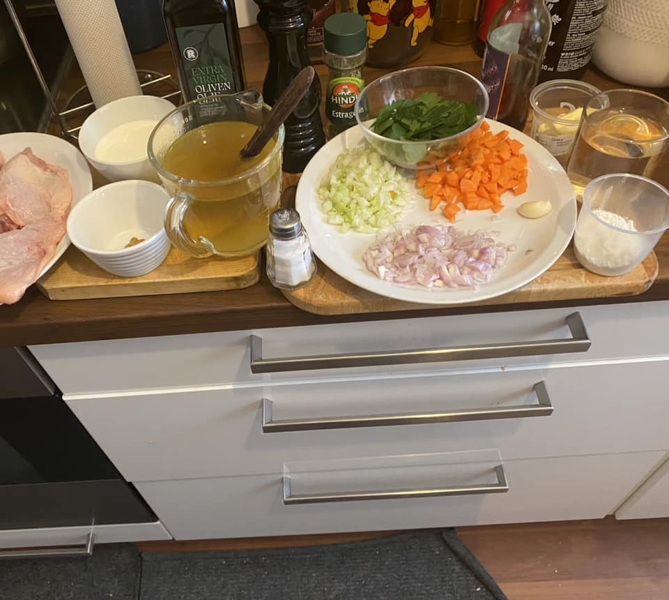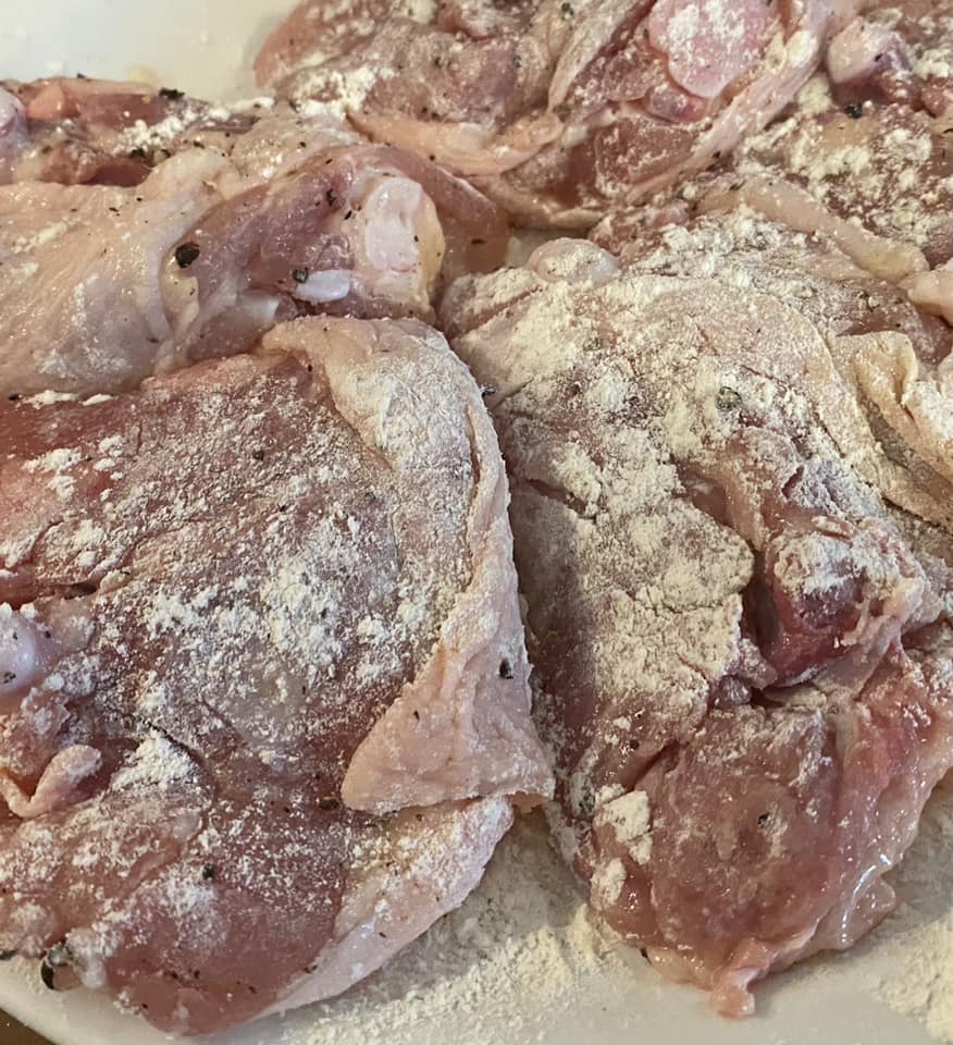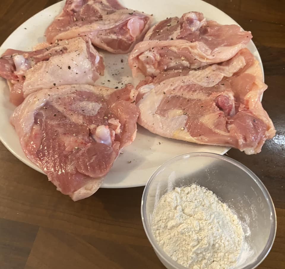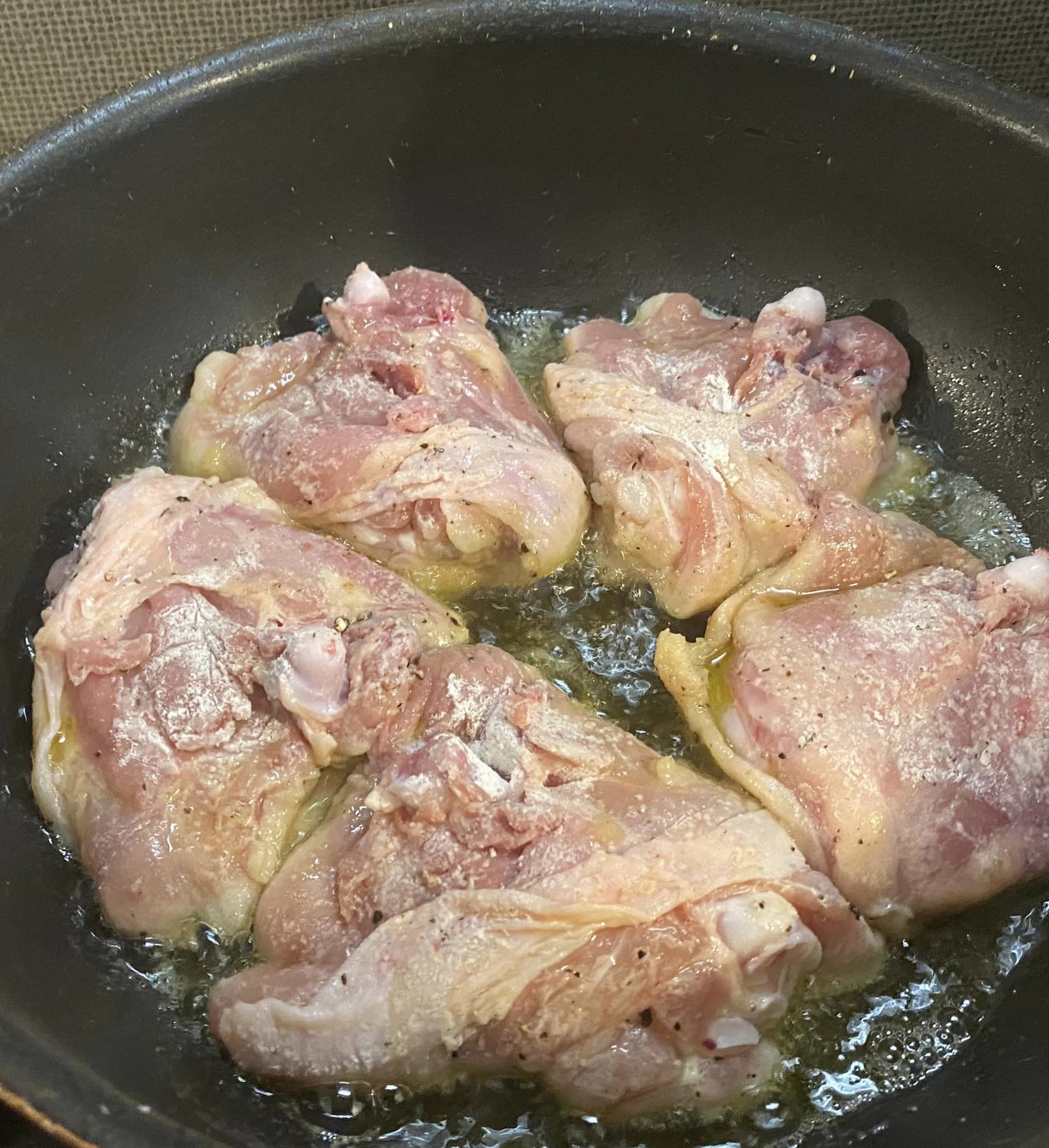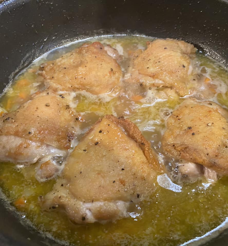 Come sempre prepariamo tutti gli ingredienti a portata di mano, evitando stress e disordine. Aromatizziamo il pollo con sale e pepe dopo averlo asciugato. Spolveriamo la farina su di esso. Quando la pentola o padella grande a bordi alti è ben calda, versiamo alcuni cucchiai di olio, e quando caldo mettiamo a rosolare il pollo pelle in giù fino ad imbiondirlo. Lo ritiriamo, inseriamo una noce di burro nel fondo di cottura e al bollore aggiungiamo lo scalogno già tagliato finemente, aggiungiamo del sale per poi inserire la carota e il sedano anch’essi tagliati finemente, e l’aglio tritato.