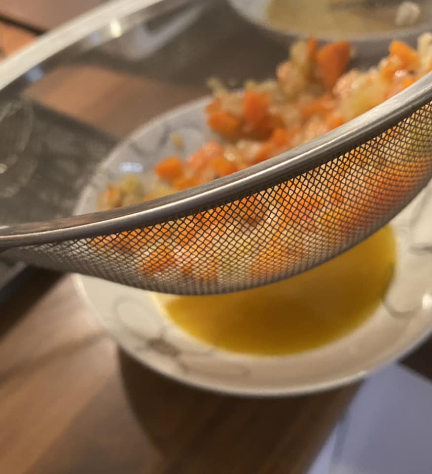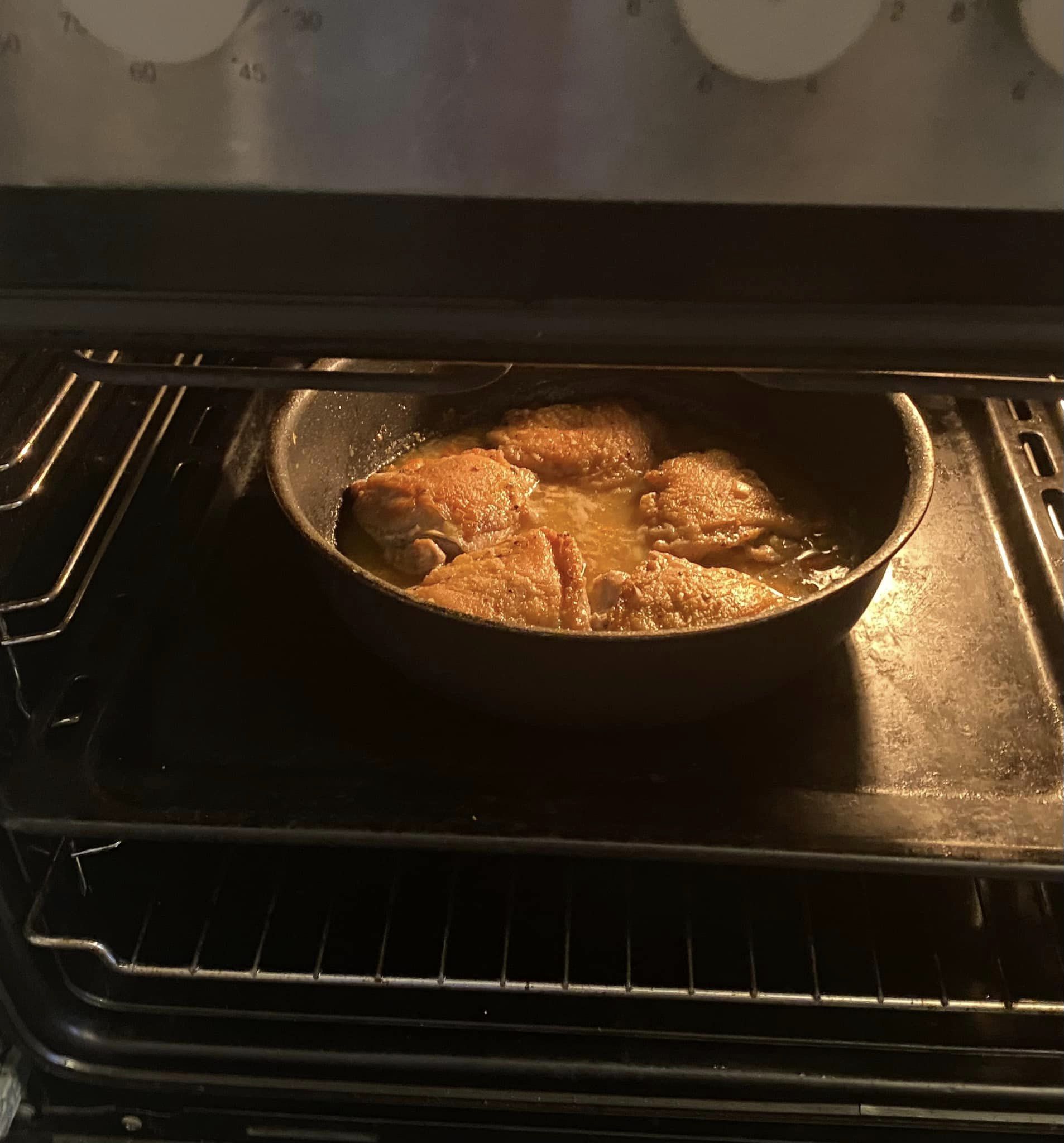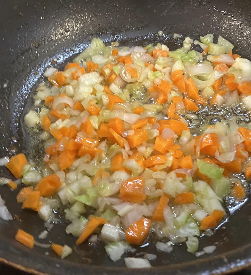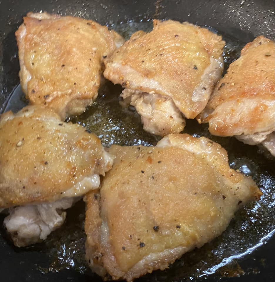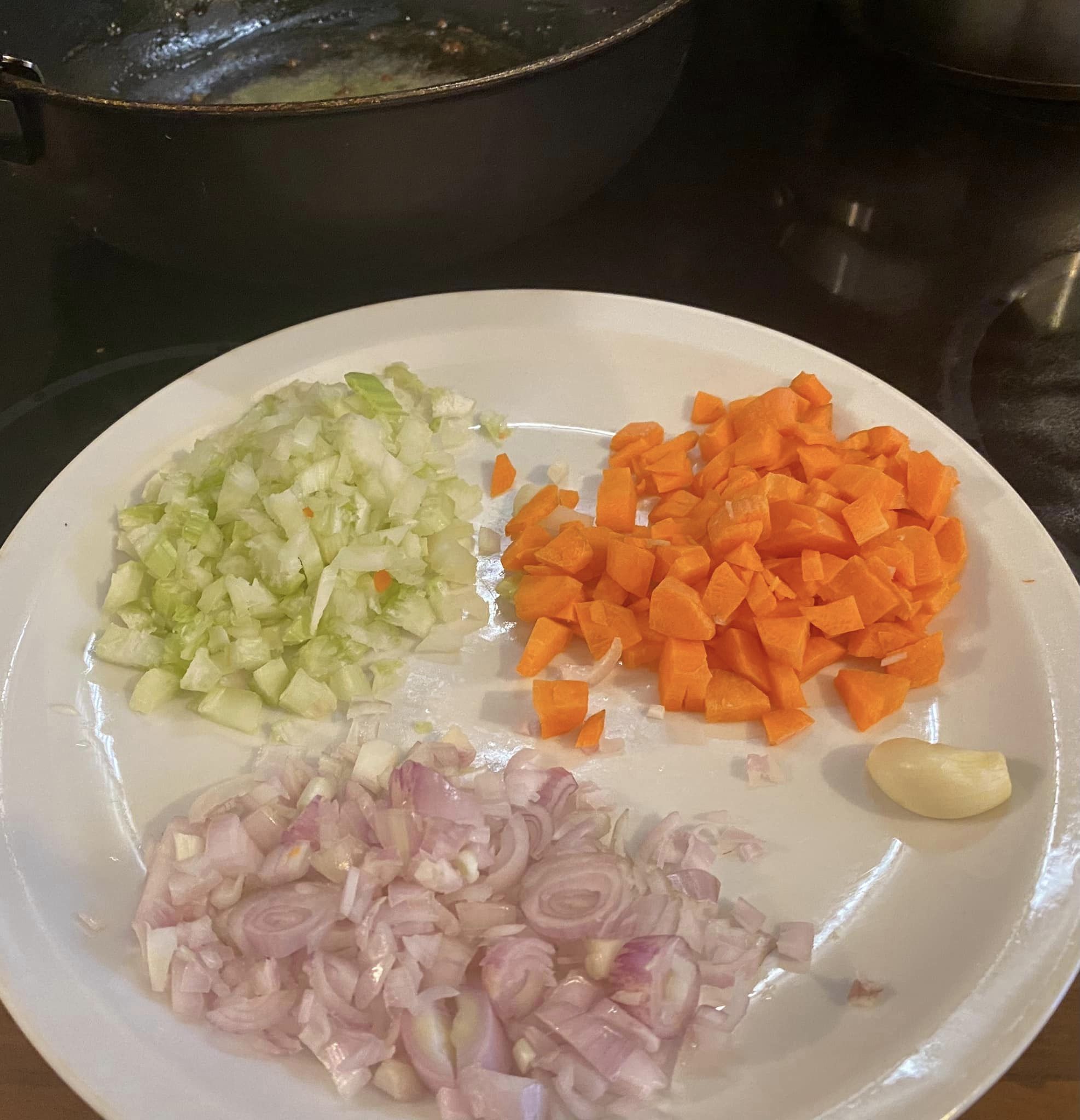 Come sempre prepariamo tutti gli ingredienti a portata di mano, evitando stress e disordine. Aromatizziamo il pollo con sale e pepe dopo averlo asciugato. Spolveriamo la farina su di esso. Quando la pentola o padella grande a bordi alti è ben calda, versiamo alcuni cucchiai di olio, e quando caldo mettiamo a rosolare il pollo pelle in giù fino ad imbiondirlo. Lo ritiriamo, inseriamo una noce di burro nel fondo di cottura e al bollore aggiungiamo lo scalogno già tagliato finemente, aggiungiamo del sale per poi inserire la carota e il sedano anch’essi tagliati finemente, e l’aglio tritato.