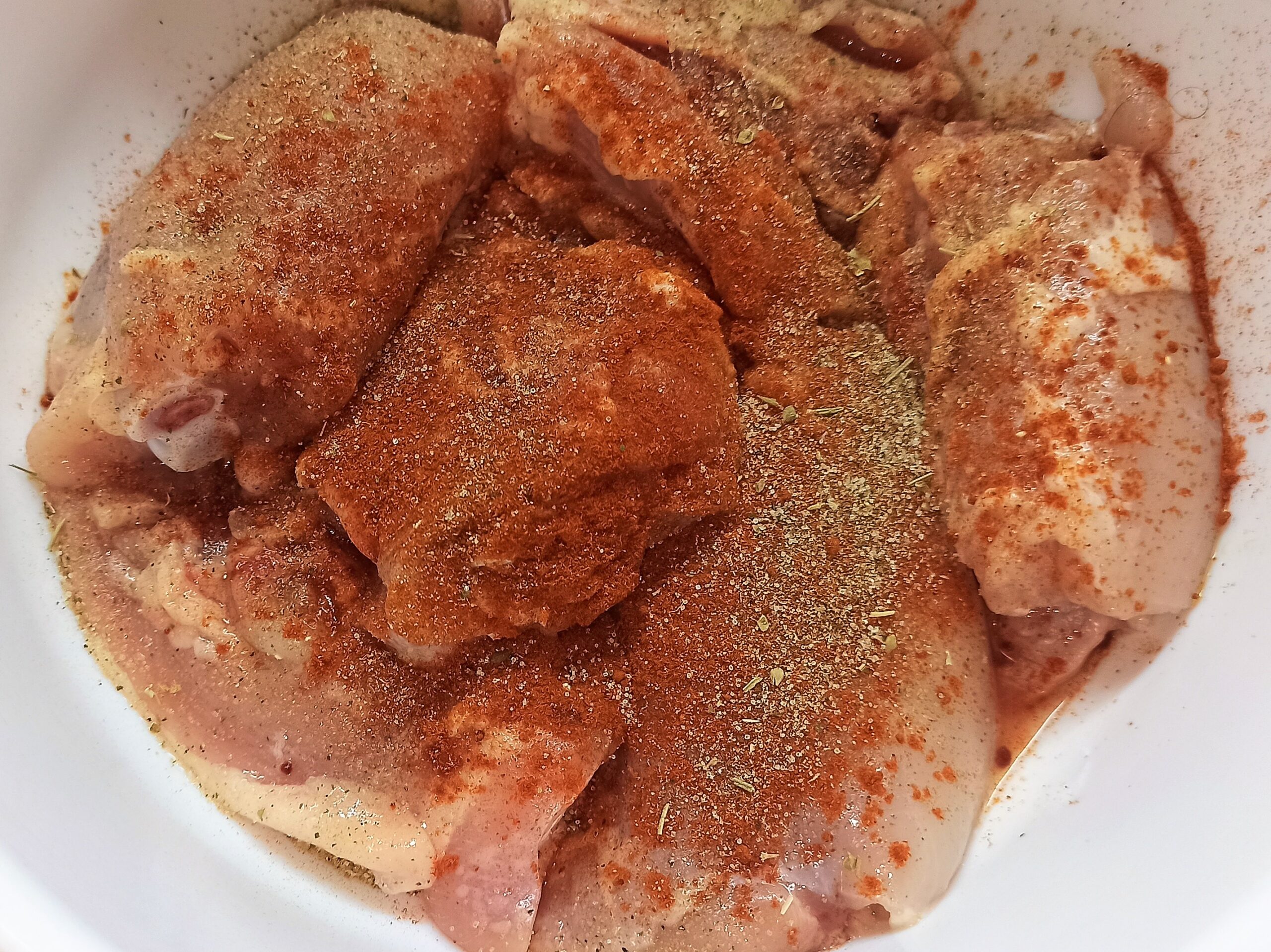 Per preparare il pollo alla diavola rivisitato, iniziate ad eliminare la pelle dal pollo, ovviamente potete anche marinare e cuocere il pollo con tutta la pelle. Mettete le parti del pollo in una ciotola, condite con un filo d’olio evo, e mescolate bene, in modo da far distribuire l’olio evo in maniera uniforme. Poi aggiungete gli aromi, la paprika, l’aglio in polvere ed il peperoncino piccante, le dosi variatele secondo i vostri gusti. Ovviamente se utilizzate gli aromi già con il sale, evitate di aggiungerne altro. Fate marinare in frigo per almeno due ore, coprendo la ciotola con una pellicole, mescolate ogni trenta minuti.