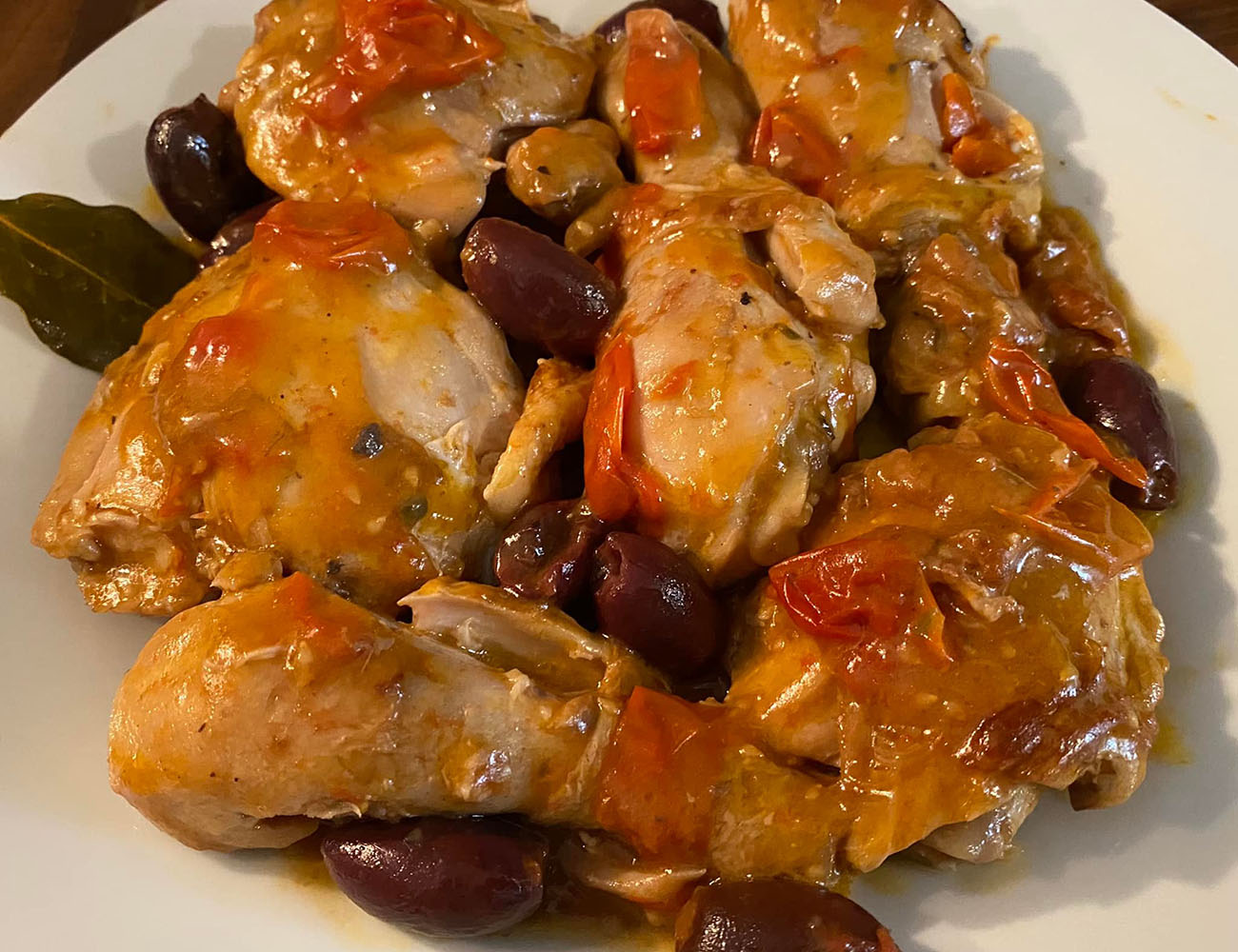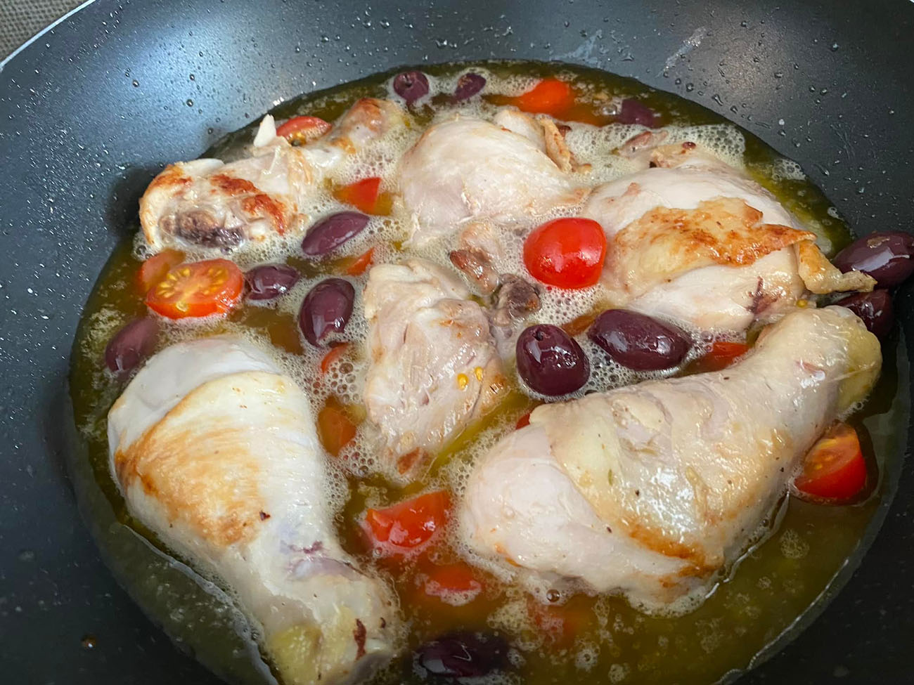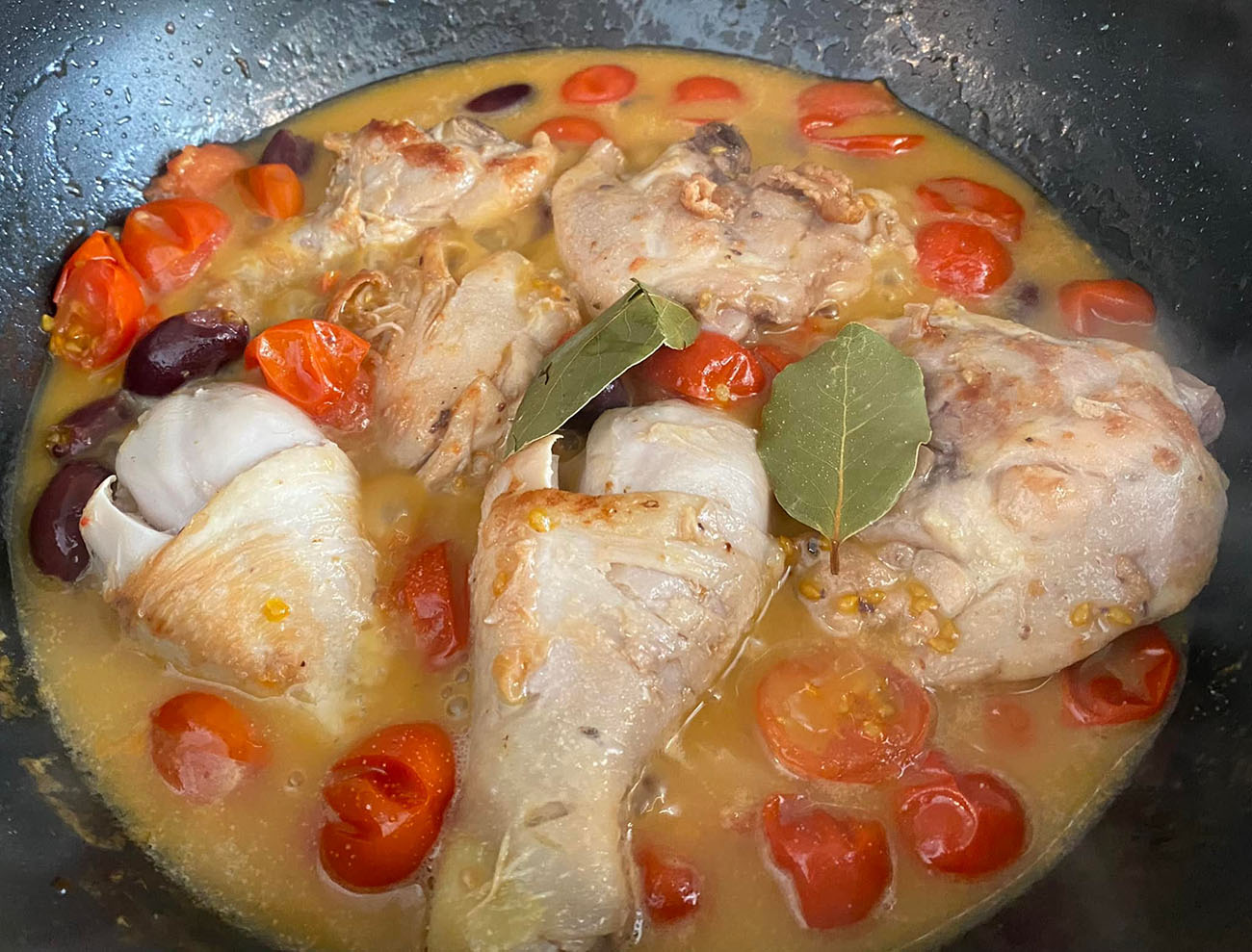 Passati i 30 minuti, durante i quali abbiamo controllato e girato i pezzi di pollo, eventualmente aggiunto ancora acqua se necessario, alziamo il coperchio e lasciamo cuocere senza di questo per altri 20 minuti, affinche’ la salsetta prenda consistenza. Impiattare e servire. Buon appetito