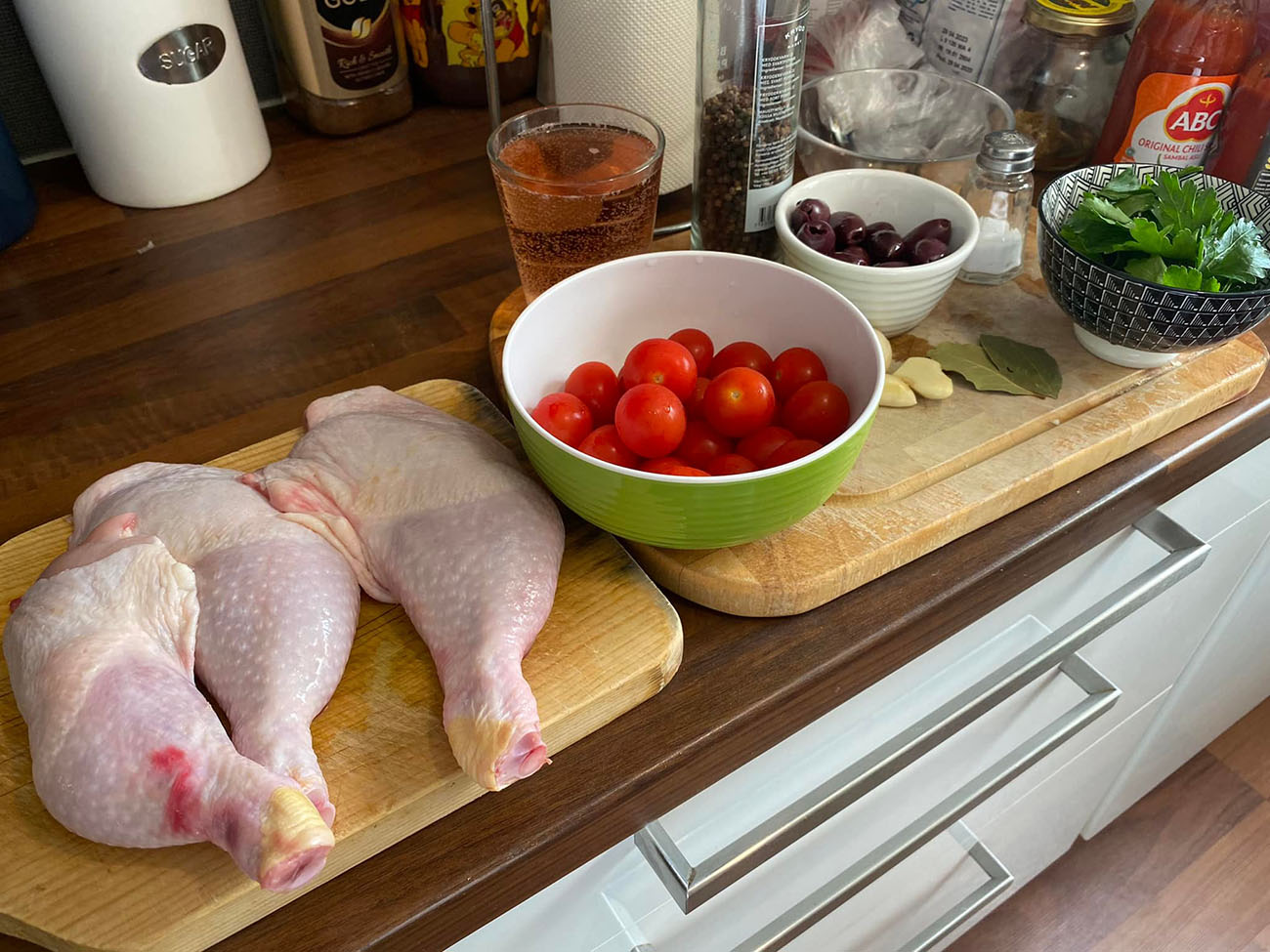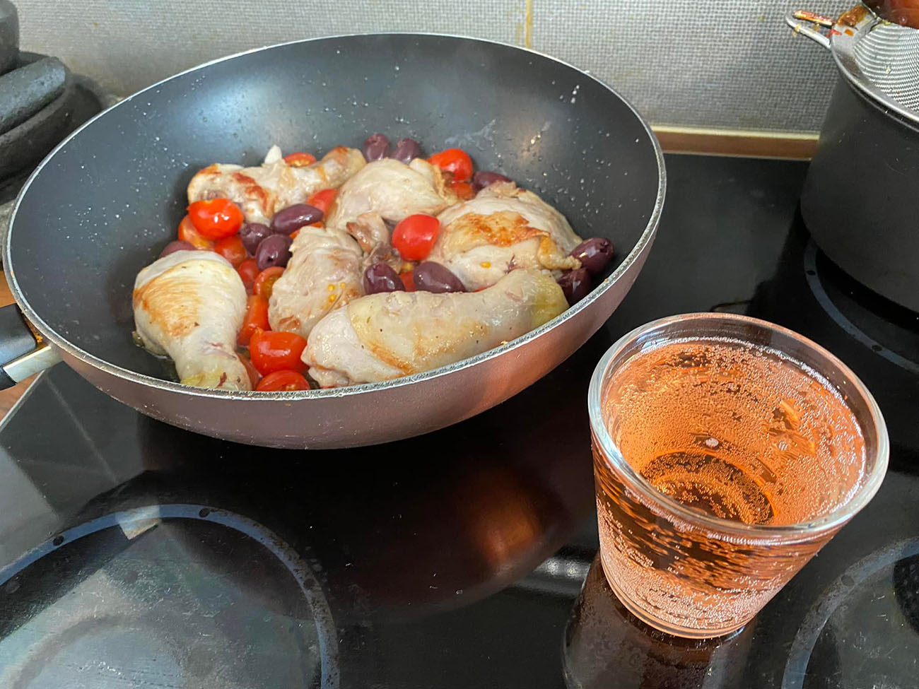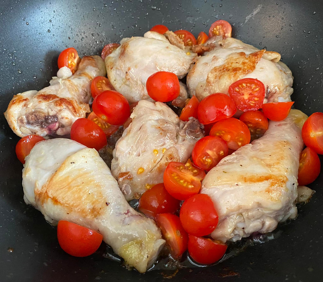 Passati i 30 minuti, durante i quali abbiamo controllato e girato i pezzi di pollo, eventualmente aggiunto ancora acqua se necessario, alziamo il coperchio e lasciamo cuocere senza di questo per altri 20 minuti, affinche’ la salsetta prenda consistenza. Impiattare e servire. Buon appetito