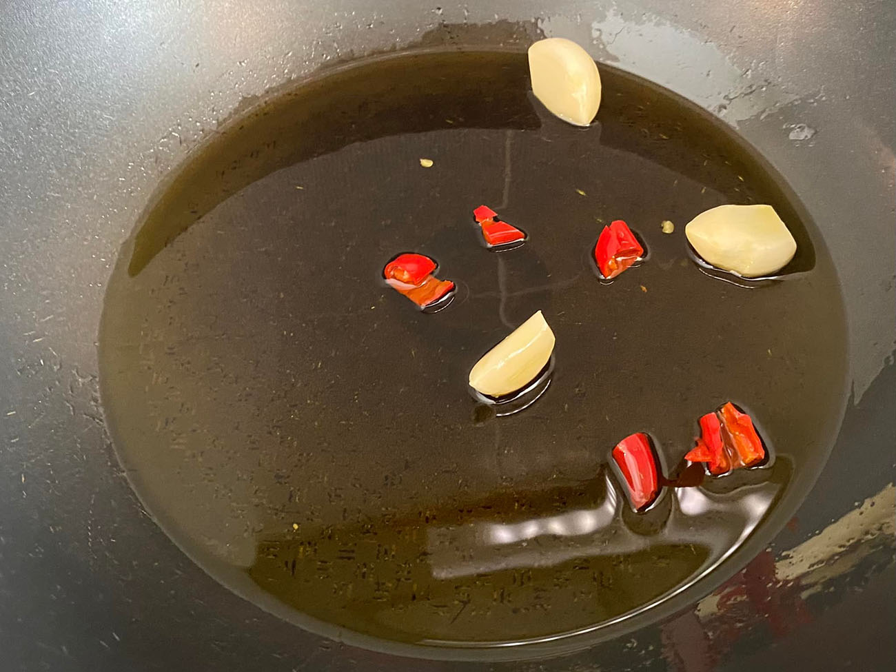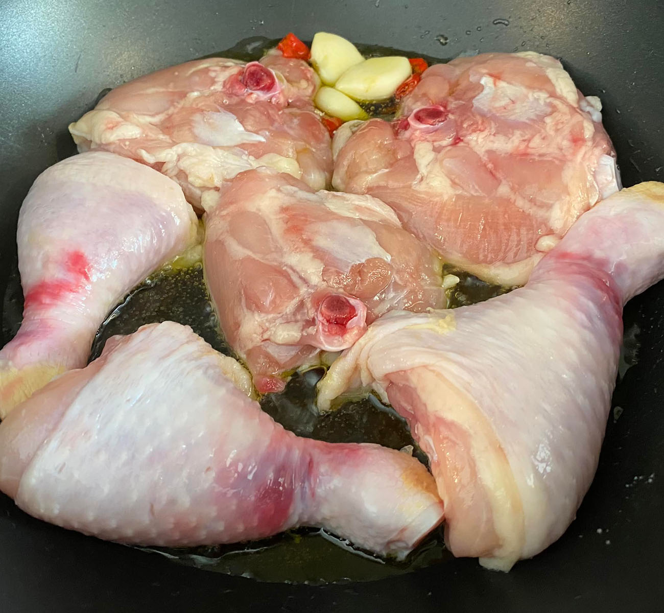 Tagliamo le cosce in due cosi da avere tre sovracosce e tre fusi. Saliamo e pepiamo quanto basta. Mettiamo una padella bella ampia a riscaldare (dovra contenere tutti i pezzi di pollo tagliati in modo che non si sovrappongano). Quando calda versiamo un giro d’olio e quando quasi caldo inseriamo l’aglio e il peperoncino tagliato a rondelli. Facciamo profumare l’olio con l’aglio e il peperoncino e poi inseriamo tutti i pezzi di pollo tagliati. Rosoliamo alcuni minuti, finche’ imbiondisca da entrambi i lati a fuoco vivace