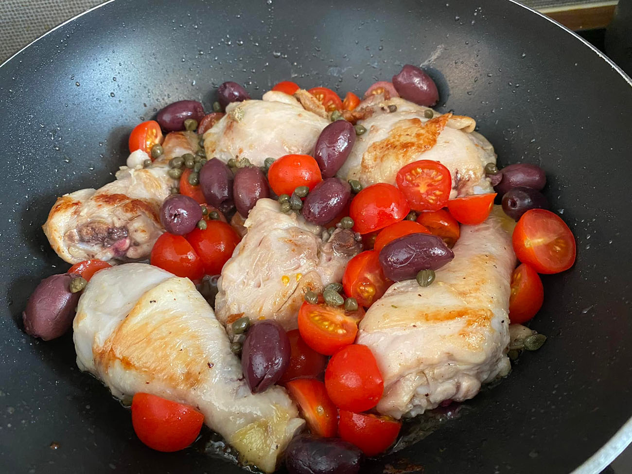 Poi e’ la volta dei pomodorini tagliati a meta’, le olive e i capperi. Cuociamo qualche minuto Sfumiamo con mezzo bicchiere di vino rose’, e lasciamo evaporare a fuoco vivace