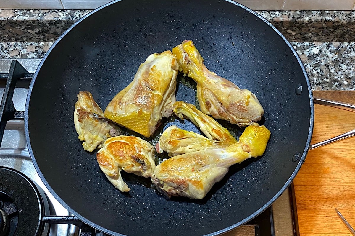 Mettete il pollo in padella con 2 cucchiai di olio di oliva e fatelo rosolare bene da tutte le parti, a fiamma allegra, fino a che non sarà tutto sigillato e con macchie marroni qua e là. Buttate tutto in un colapasta e fate scolare il grasso presente.