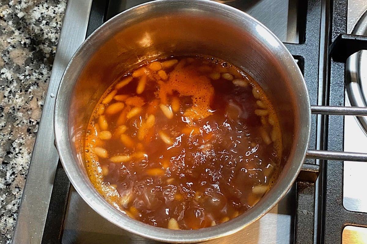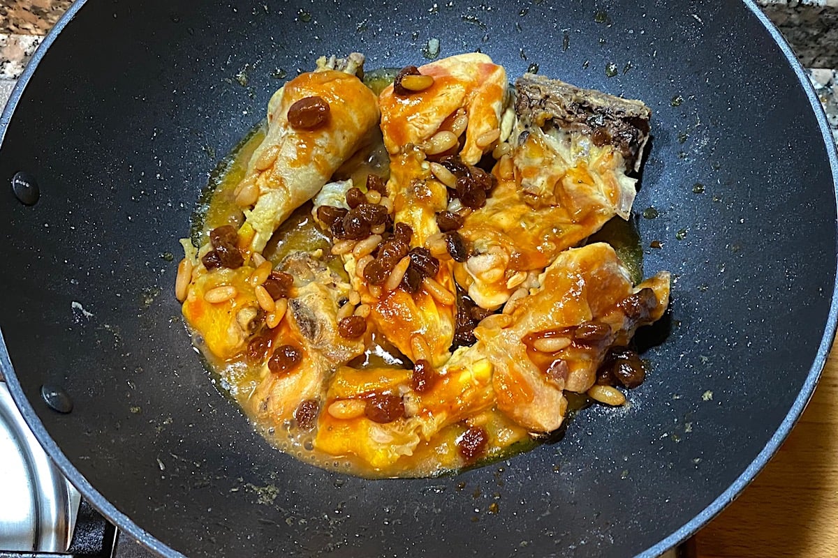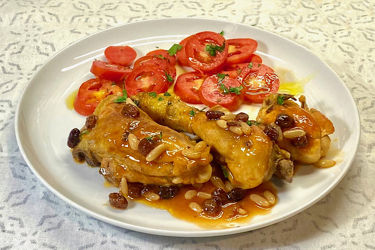 SALSA AGRODOLCE – Mettete in un tegamino un bicchiere (250 ml) pieno per metà di vino bianco secco e per metà di un buon aceto di vino. Aggiungete un cucchiaio colmo e uno raso (30 g) di zucchero e 6 cucchiai (60 g) di passata di pomodoro. Mischiate bene e mettete sul fornello con fiamma che lo faccia bollire dolcemente. Il contenuto del tegamino si dovrà restringere del 50%, quindi controllate il livello iniziale e il procedere della cottura. Quando questa salsa sarà quasi ristretta al punto giusto, aggiungete un cucchiaio colmo e uno raso di pinoli e altrettanta uvetta. Rimestate e quando la salsa è pronta spengete la fiamma e aspettate che sia pronto anche il pollo.