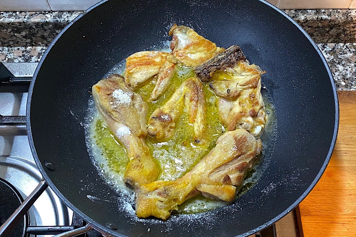 Asciugate la padella con carta da cucina e rimetteteci il pollo con 1 cucchiaio di olio di oliva. Infarinatelo, salatelo e pepatelo. Fatelo scaldare bene poi bagnate con mezzo bicchiere di vino bianco secco. Coprite quasi del tutto e cominciate la cottura a fiamma dolce, col liquido di cottura che sobbolle tranquillamente. Ogni tanto girate i pezzi. Per tutta la cottura, se il fondo si asciugasse troppo, bagnate con poca acqua calda.