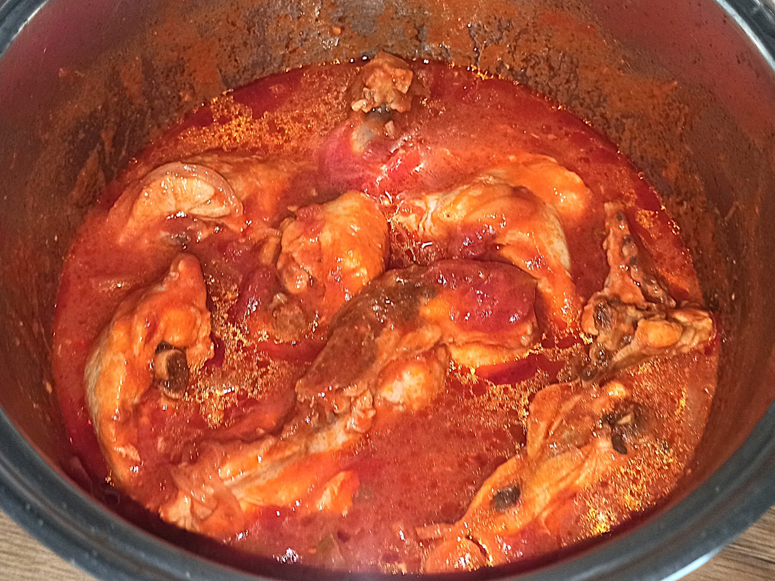 La cottura finale poi dipende dalla grandezza dei pezzi di pollo. Se il sugo risulterà moto liquido, ed il pollo cotto, potete toglierlo dalla pentola, fare restringere il sugo, poi rimettete il pollo nel sugo. Mescolate servite e gustate caldo.