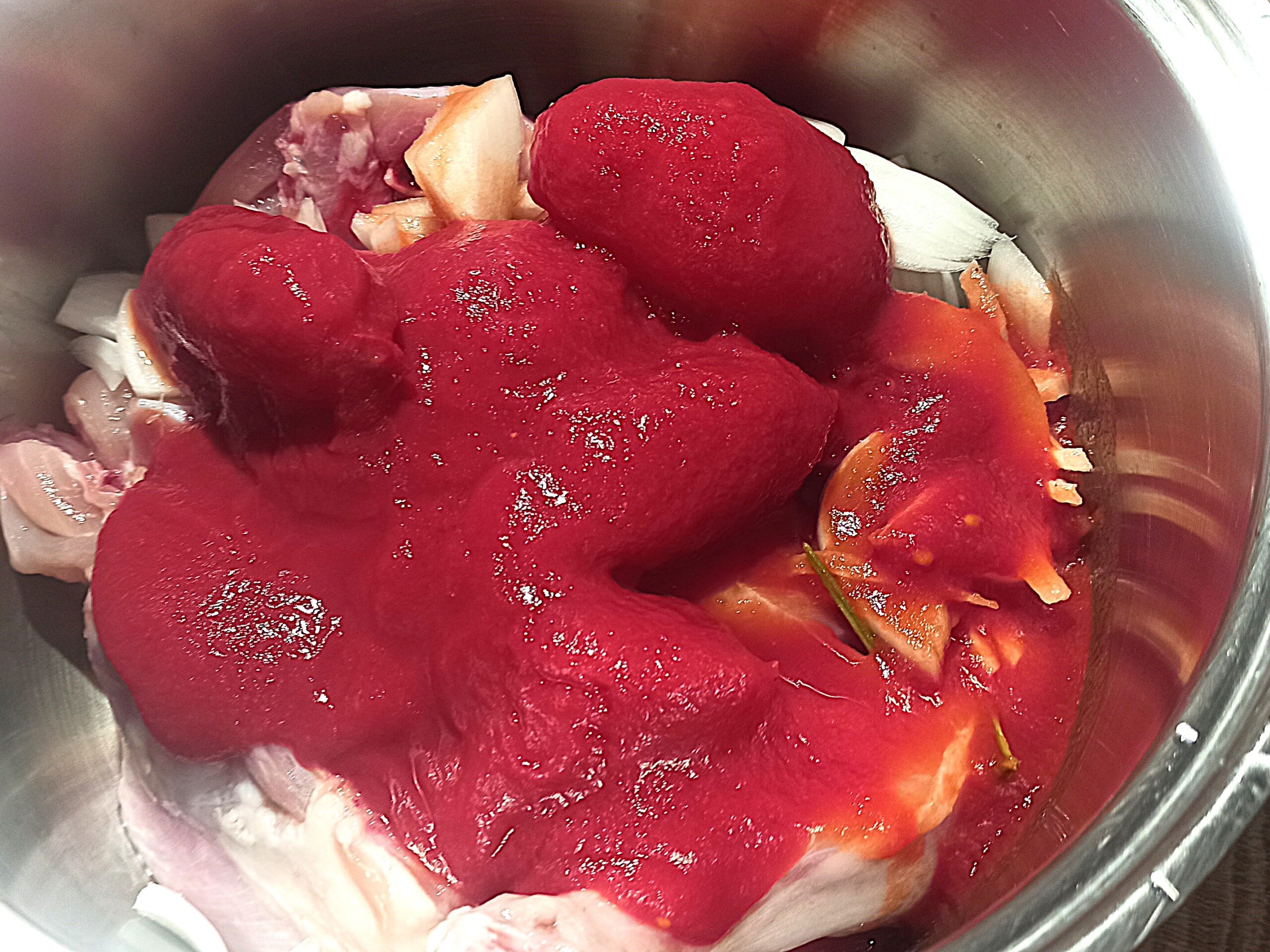 le cipolle tagliate a fettine sottili, ed infine i pelati.