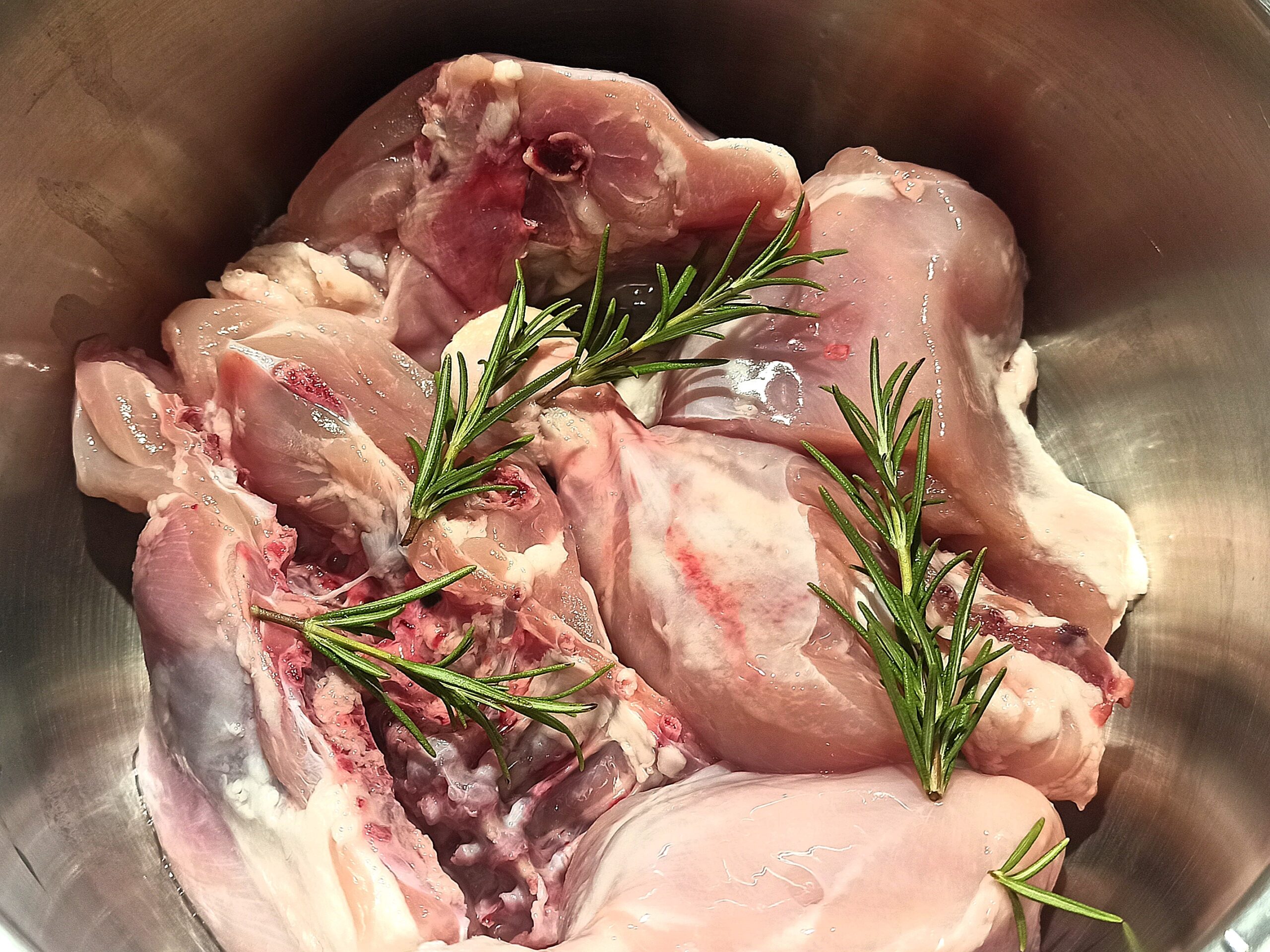 Per preparare il pollo in umido con cipolle e rosmarino, iniziate ad eliminare la pelle dai pezzi di pollo. Poi metteteli in una capiente casseruola, aggiungete il rosmarino,