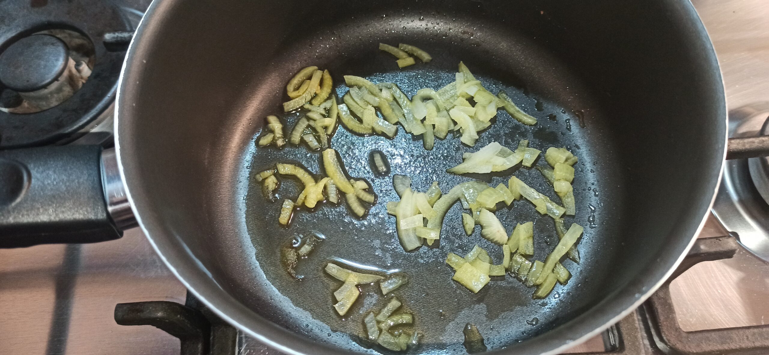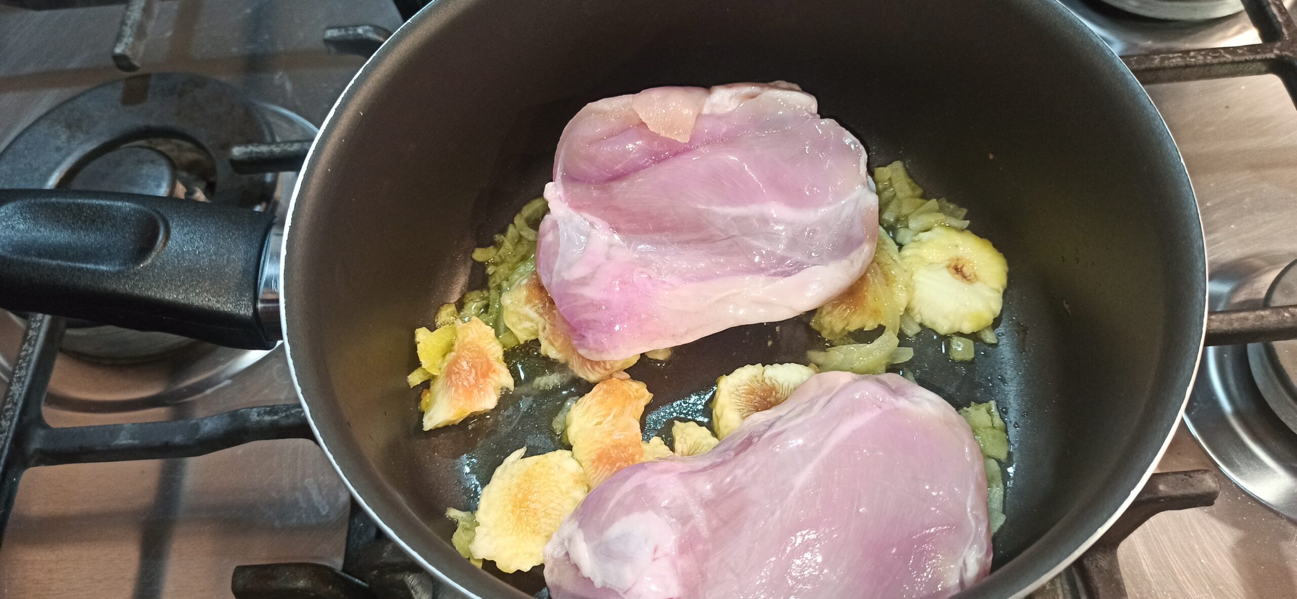 Per preparare il pollo settembrino, iniziate a tagliare finemente la cipolla, mettetela in un tegame insieme ad un giro d’olio evo, e lasciatela imbiondire leggermente a fiamma dolce.