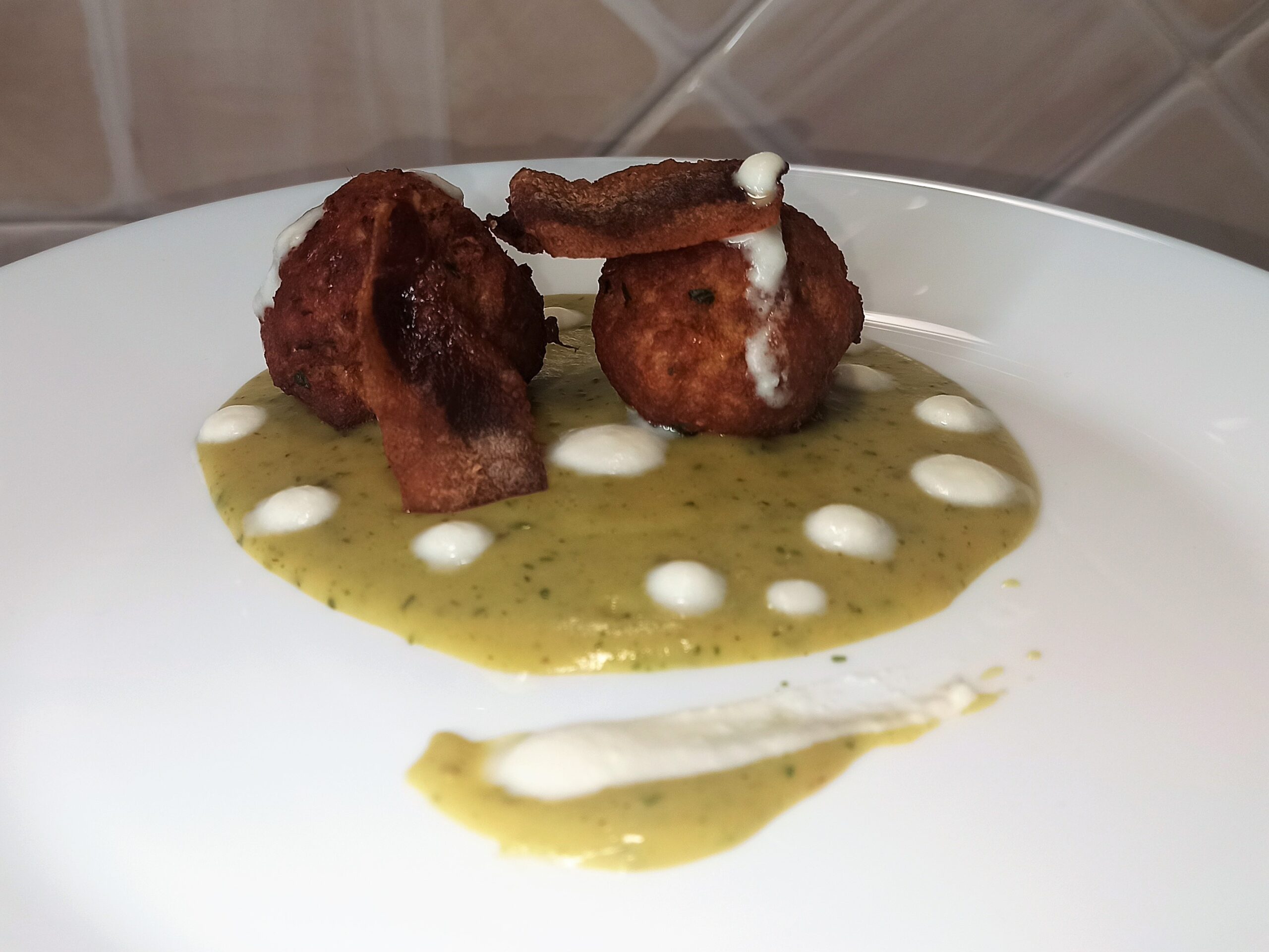 Adesso siete pronti per assemblare il piatto. Posizionate sul fondo del piatto da portata, un poco di crema di zucchine, adagiate al centro le polpettine, e completate con il guanciale croccante e la crema di parmigiano.