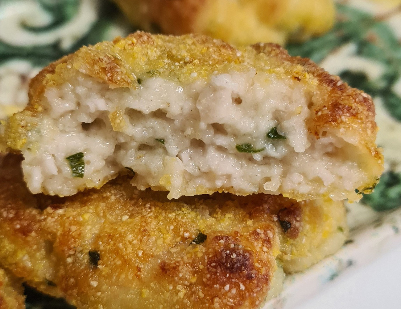 Iniziamo la preparazione Frullando tutti gli ingredienti: In un mixer inserire la mozzarella , il petto di pollo tagliato a pezzetti, il pancarré spezzettato , il parmigiano , il prosciutto cotto , un po’ di prezzemolo e un pizzico di sale. Frullare fino a ottenere un composto omogeneo e compatto. Adesso non ci resta che Formare le polpette: Prelevare una piccola quantità di impasto e formare delle palline con le mani. Passarle nella farina di mais , in modo che non risultino ben impanate e croccanti in cottura.